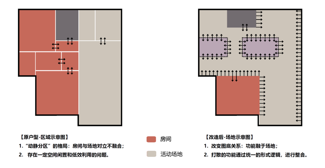 如果还局限在房间的划分上,一家三口那么多的需求,是根本放不下的。所以从整体来看,改造思路可以用「大破大立」来形容。