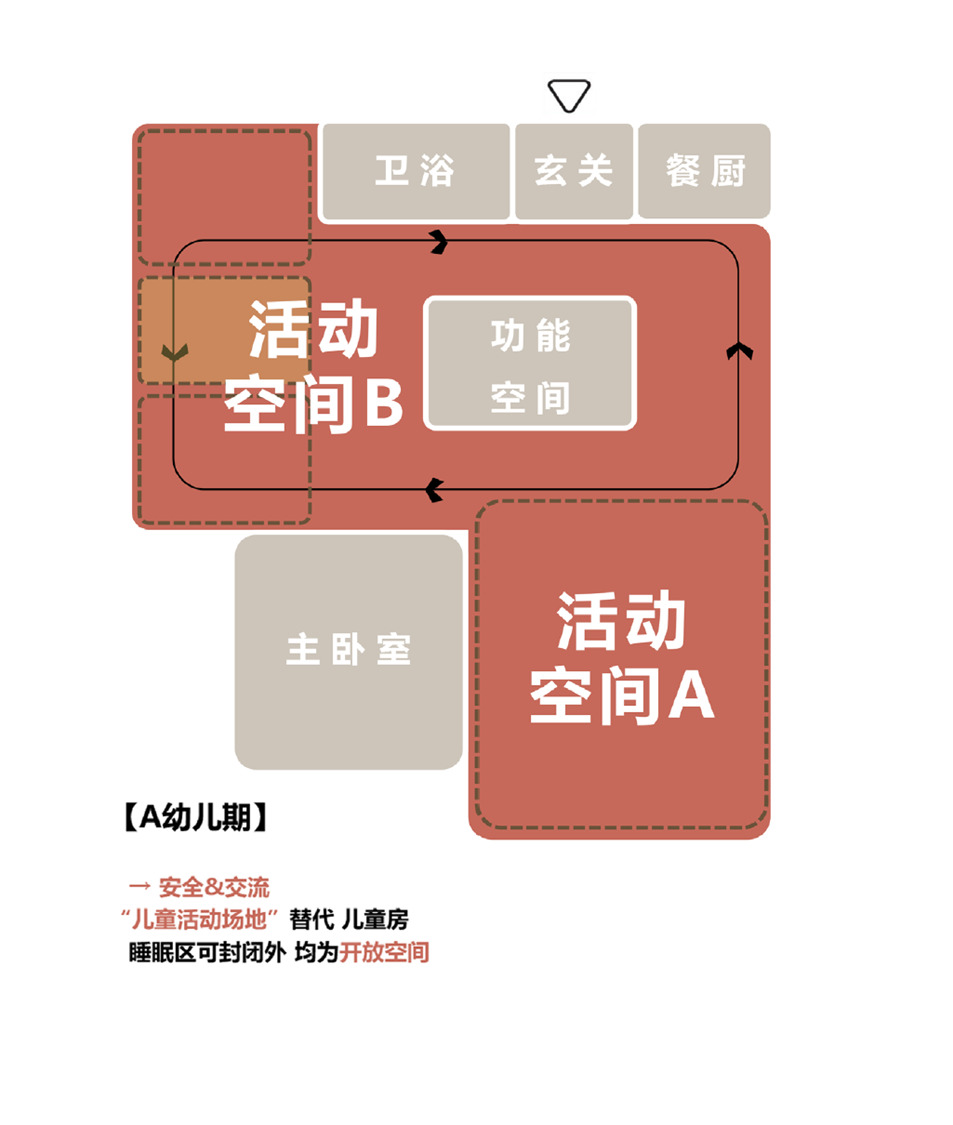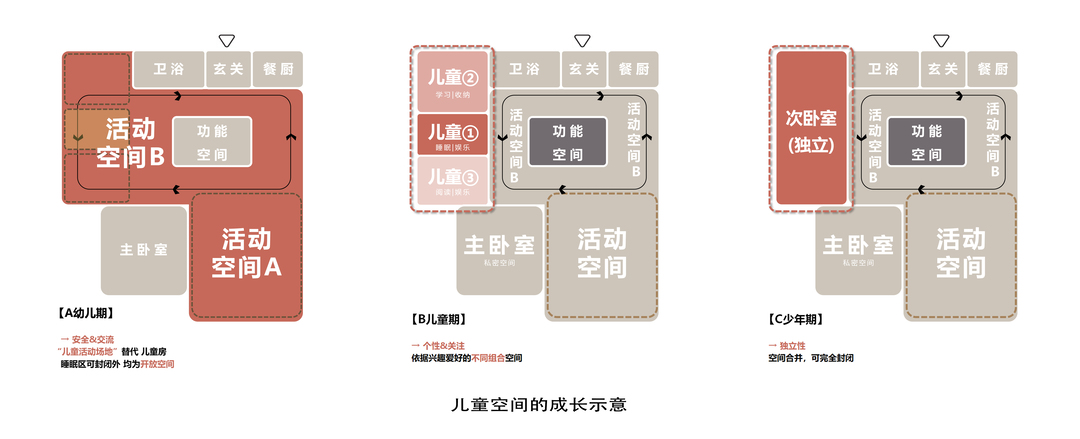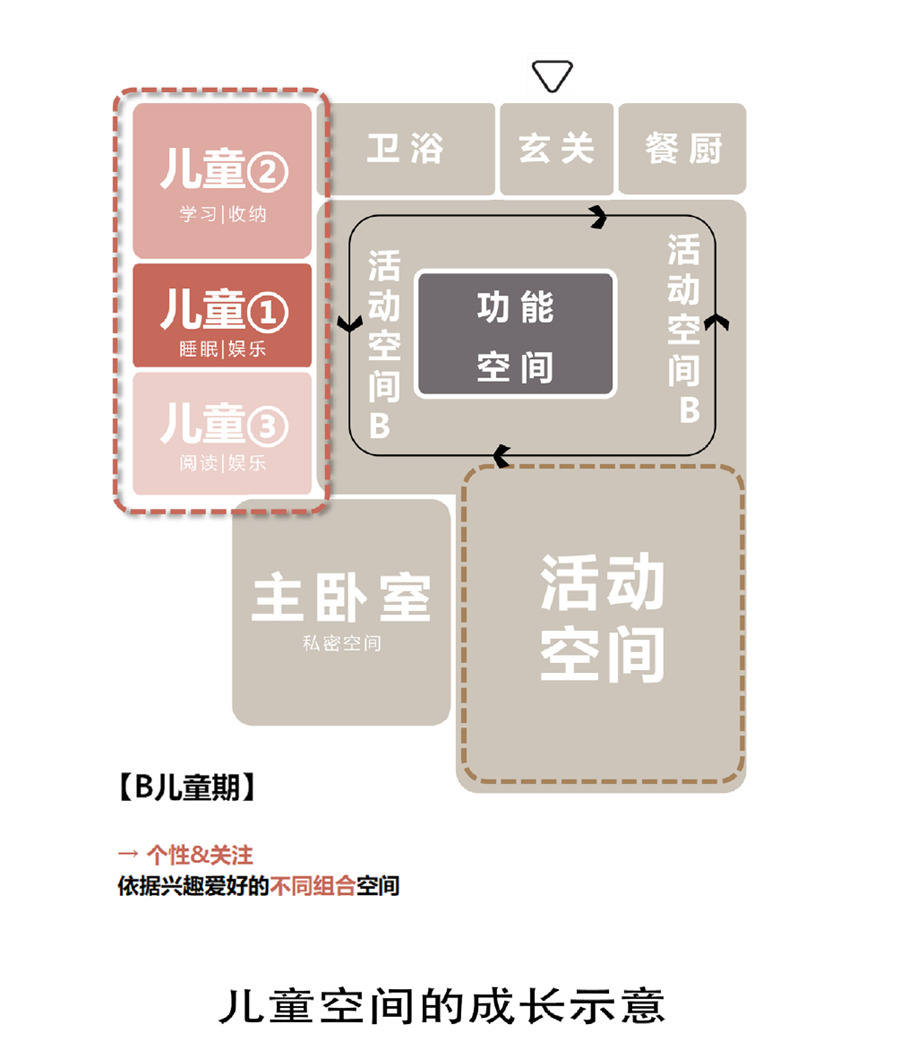再往里走,是跟着宝宝一起成长的“儿童活动空间”。说到“儿童活动空间”,如果还是局限在“儿童房”里,未免太过狭隘。在这里,我们把儿童的成长分为三个阶段(幼年-儿童-少年),而相对应地,儿童活动空间,也需要在这三个阶段里有不同的拆分组合模式。