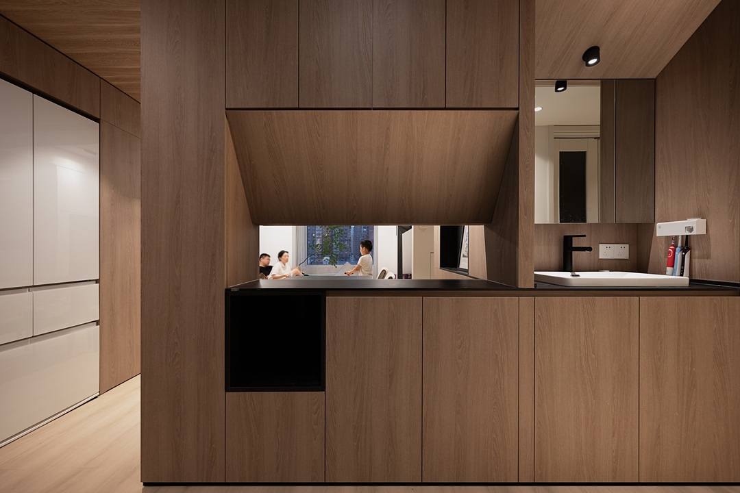 这里是“洄游盒子”的背面,也是全屋最消极的位置,承重墙碍事,采光也无法触达。然而,正是这样一个消极区域,给了我们更多填充功能的契机。
