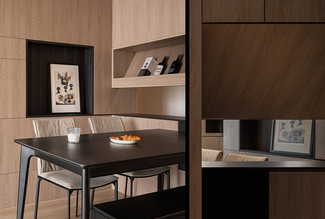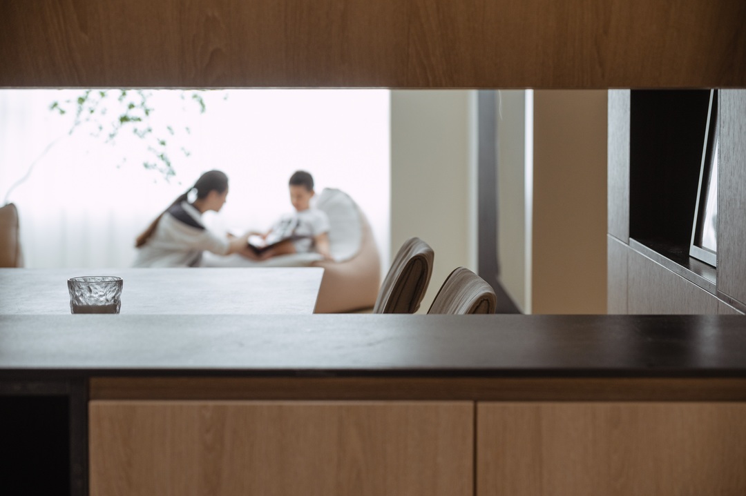 在这里,玄关窗景也可以是烹饪区的传菜口,爸爸做饭,儿子就从餐桌这边端菜。
