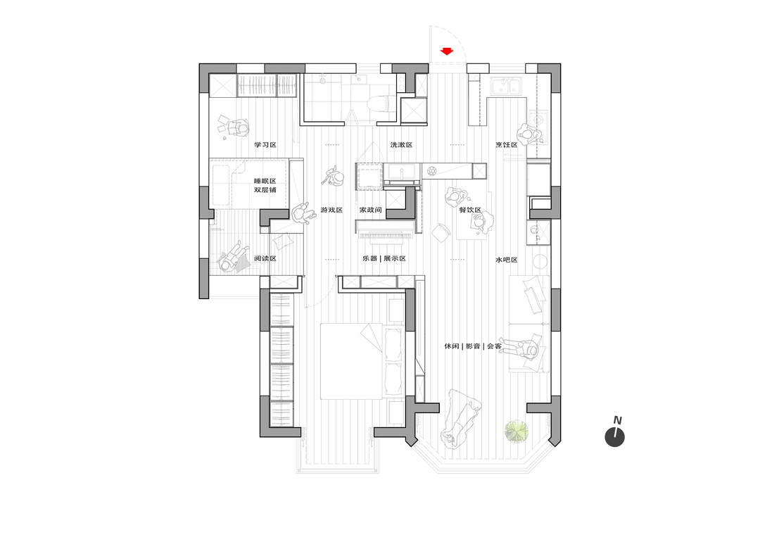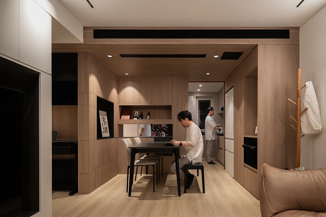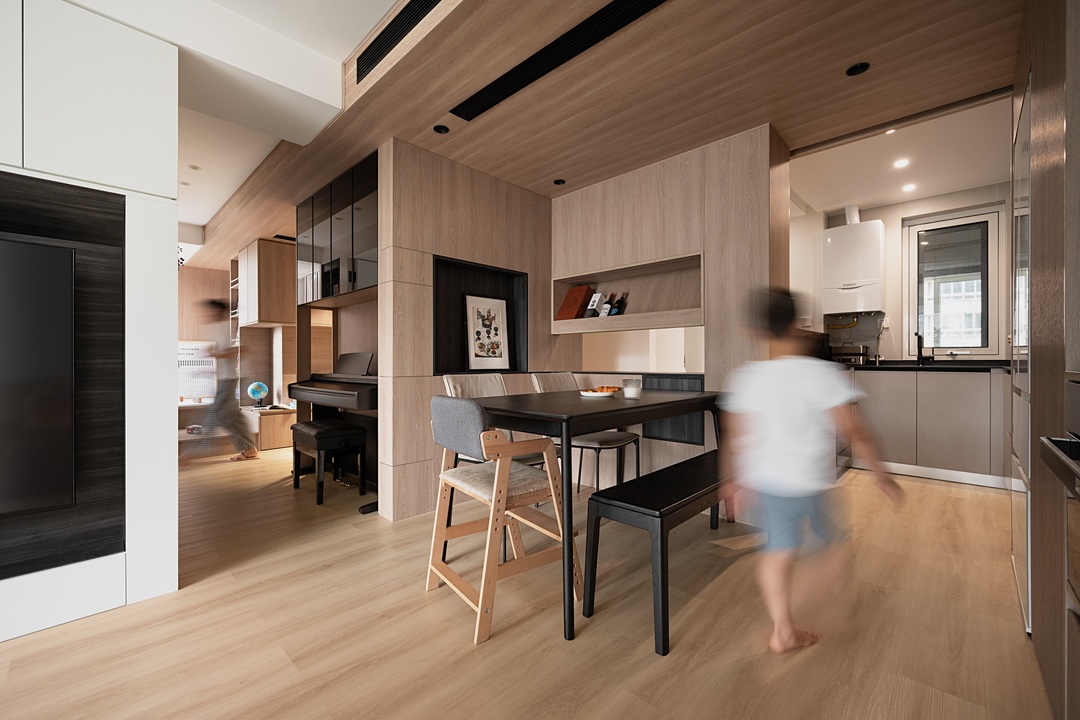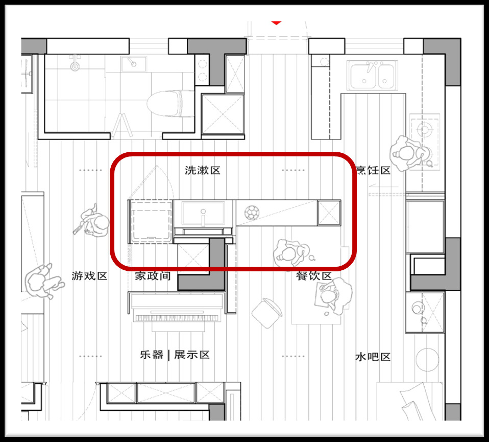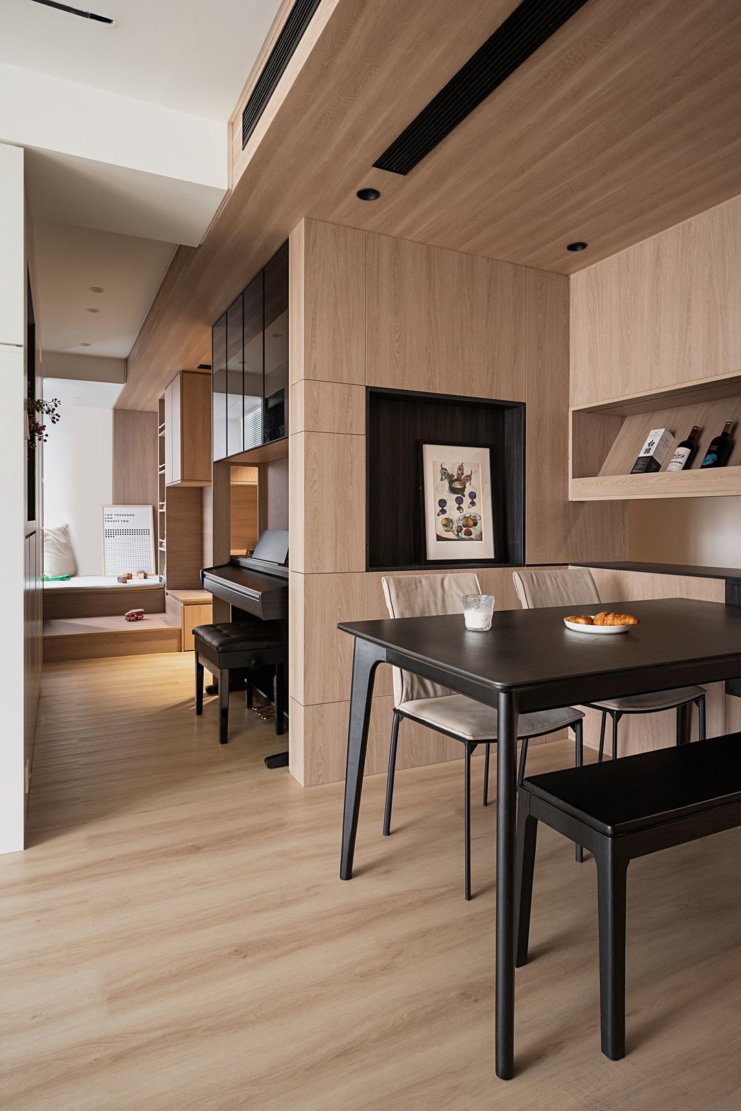 餐饮区、钢琴区、玄关、家政间结合成为一个大盒子,家就都围绕着大盒子游了起来。