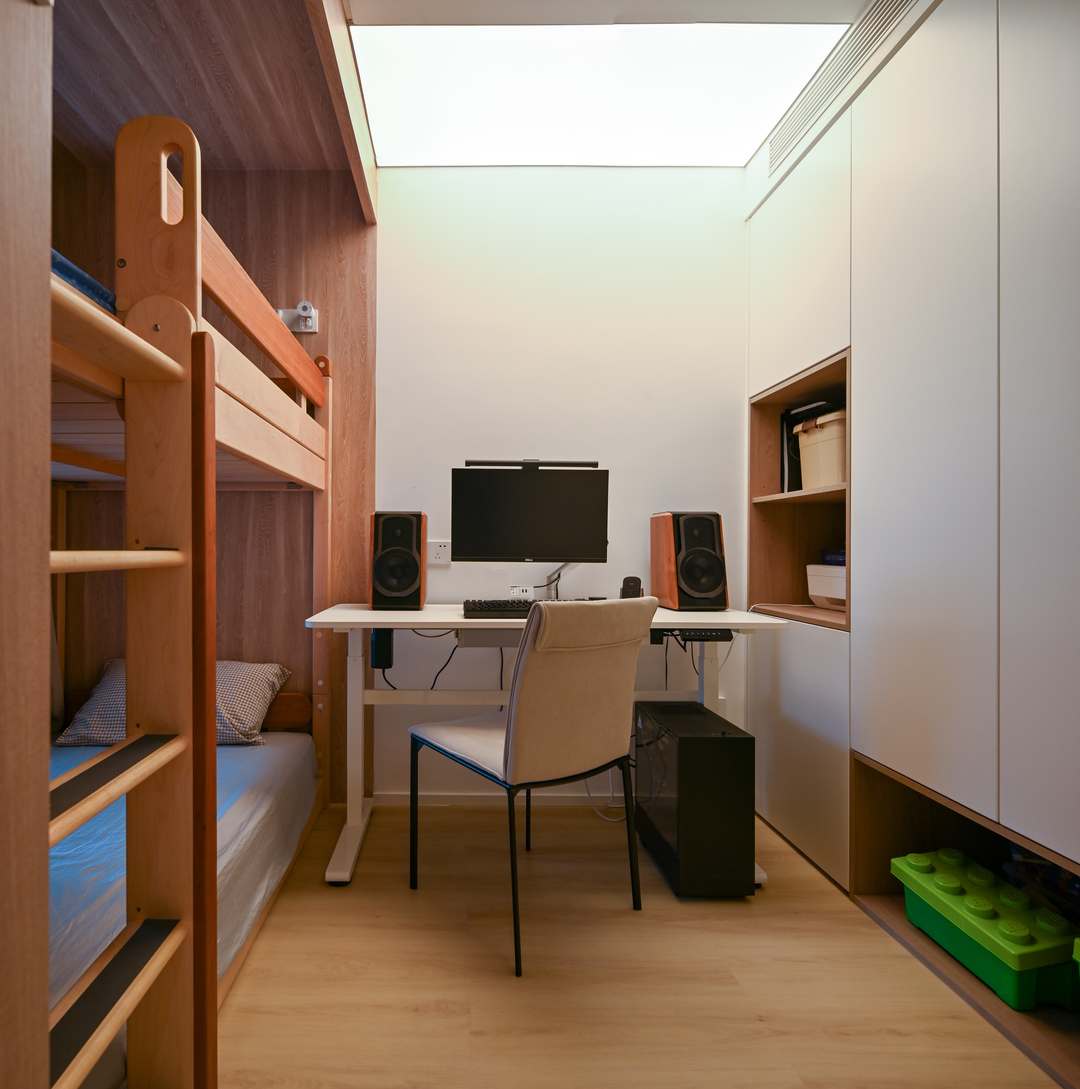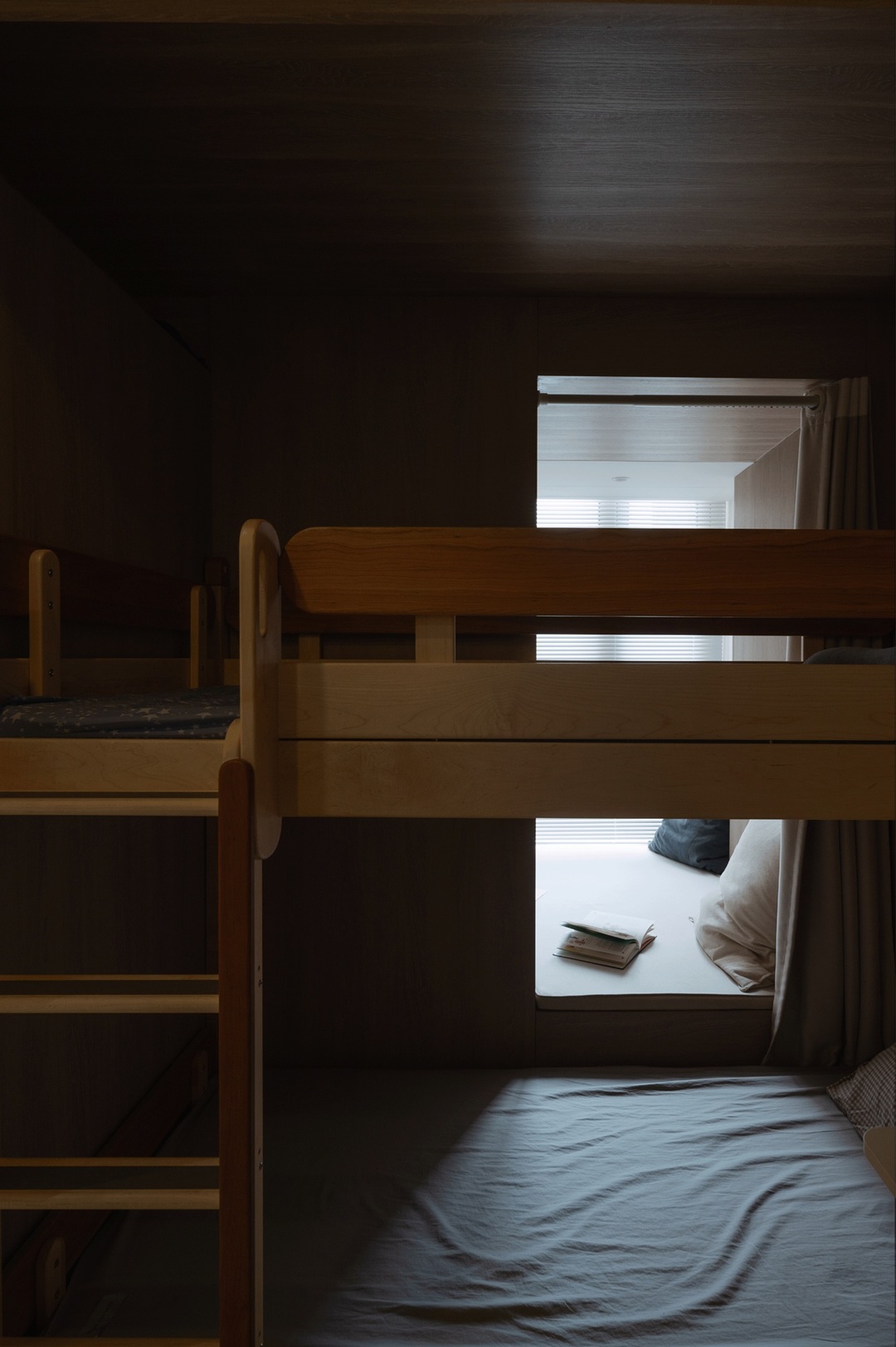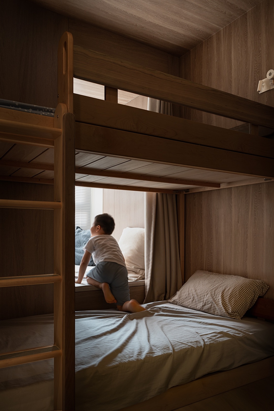 这里休息区做了上下铺,平时业主夫妇外出上班时,长辈来家里帮忙带娃,下铺就可以作为临时午休的场所。