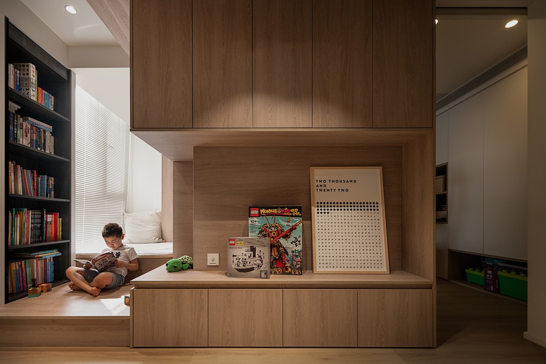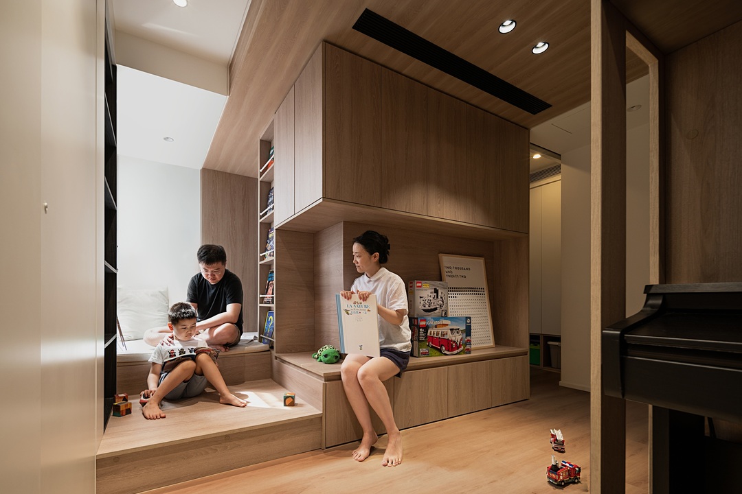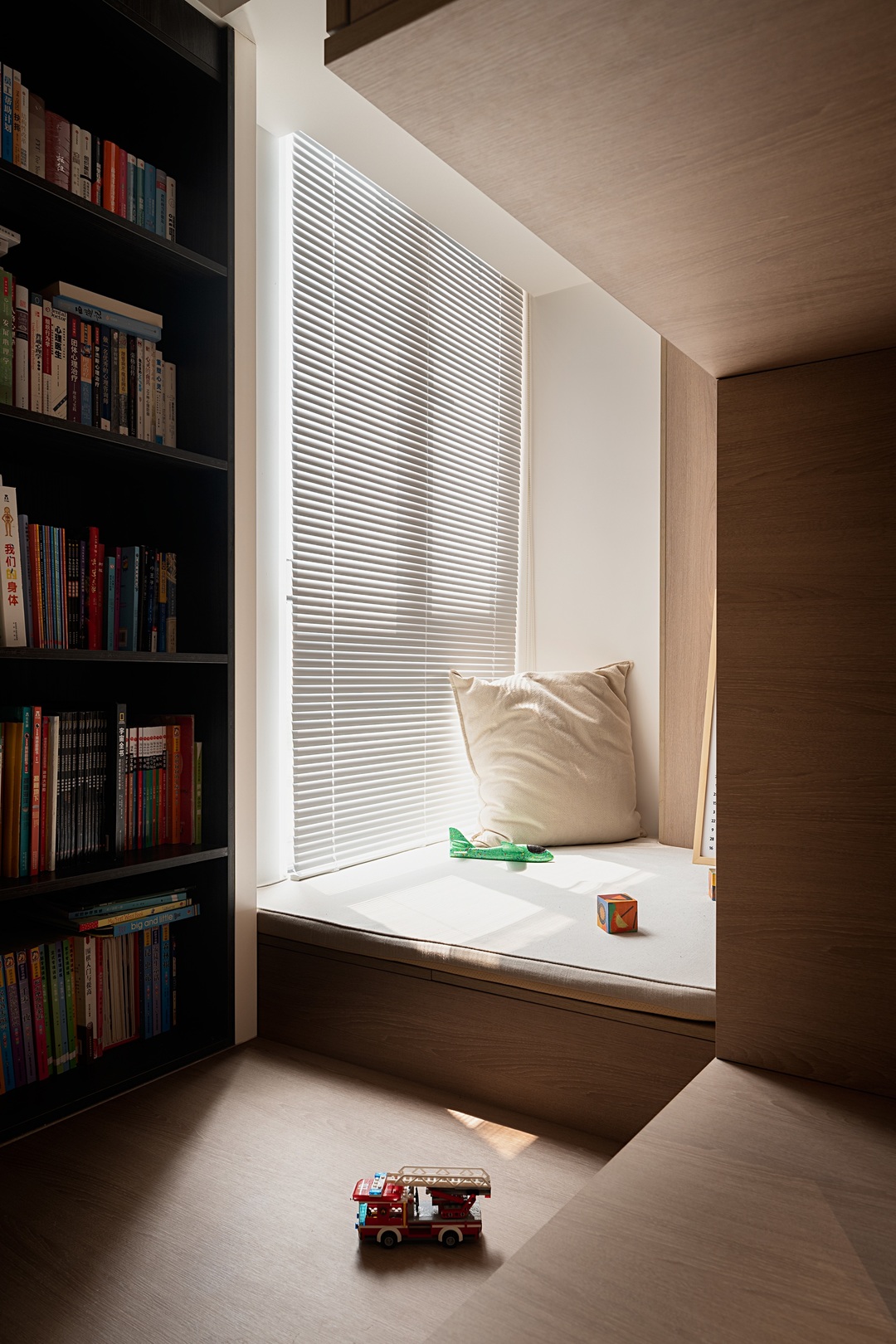 不管是独自看绘本晒太阳,还是跟爸妈一起拼拼图,错落的地台让每个家人都能找到最舒服的姿势。