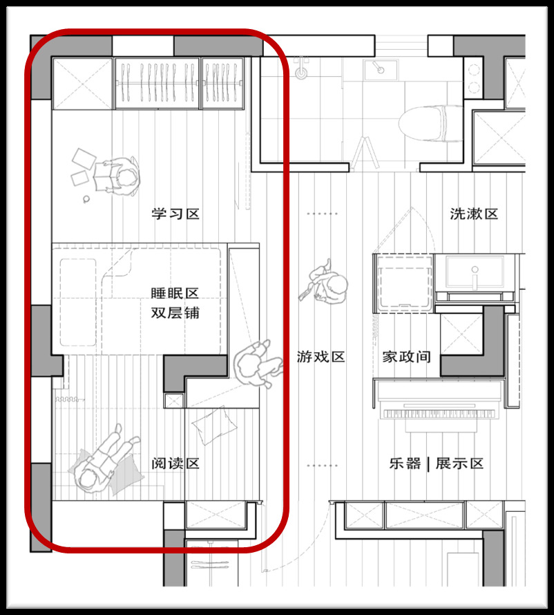 儿童期,当宝宝大一点了,需要培养自己的个性和兴趣爱好时,左边空间就被分成了三个部分:学习、睡眠和游戏。①②结合,就是宝宝独立学习写作业的儿童房,宝宝要拼乐高、看课外书了,③纳进来,就是一个功能完整的儿童空间。