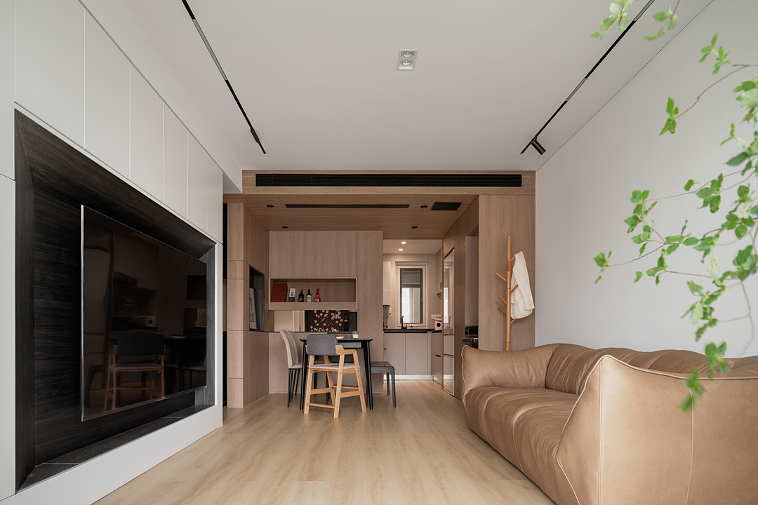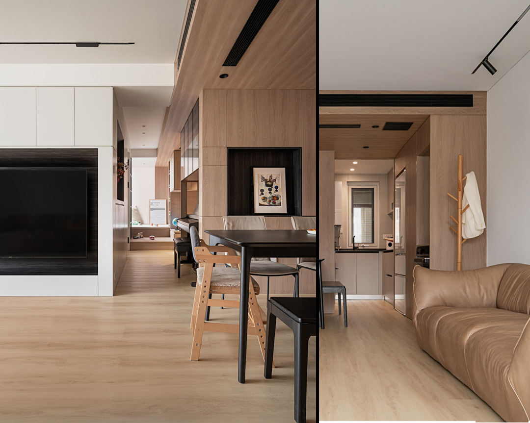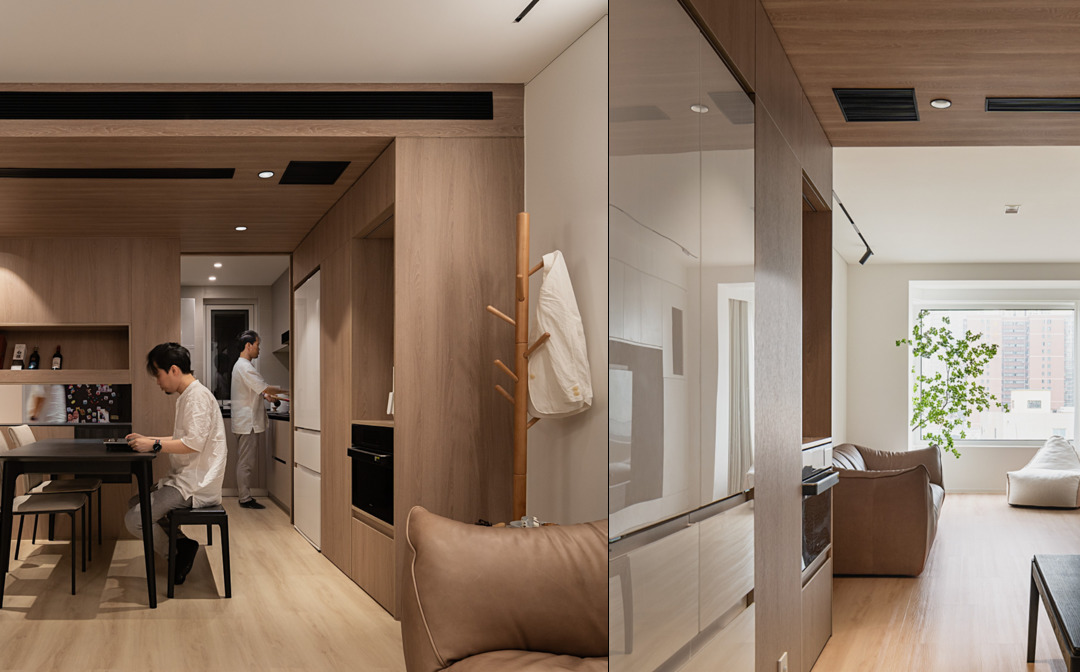把该打开的都打开之后,我们得到了一个以中间承重墙为中心的,动线自由的开放空间。在这里,只有业主夫妇的主卧是独立的“禁区”,这以外的全部区域,都可以让爱奔跑的小宝宝自由地玩起来。而细节处的各个功能,都承接了不同区域的多重需求。如此不断地让各种功能把不同空间衔接交叠,全屋的利用率比起原来,提升了50%。可以说,像乐高一样,将各个空间不断地交叠和拆分,这套房子就成了跟着孩子一起长大的家。具体什么意思?下面我们来这个家里,仔细逛逛。