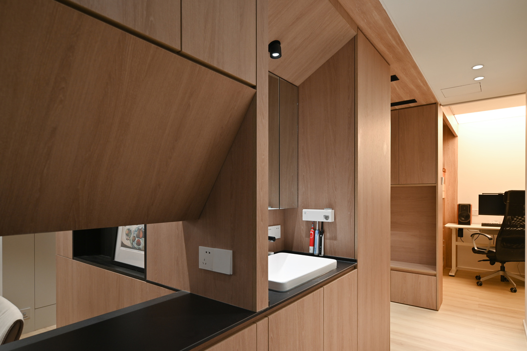 洗漱区单独拎出来,既服务玄关回家洗手的卫生需要,又满足小朋友玩耍后洗手需求。早高峰使用也不跟里面卫浴打架。
