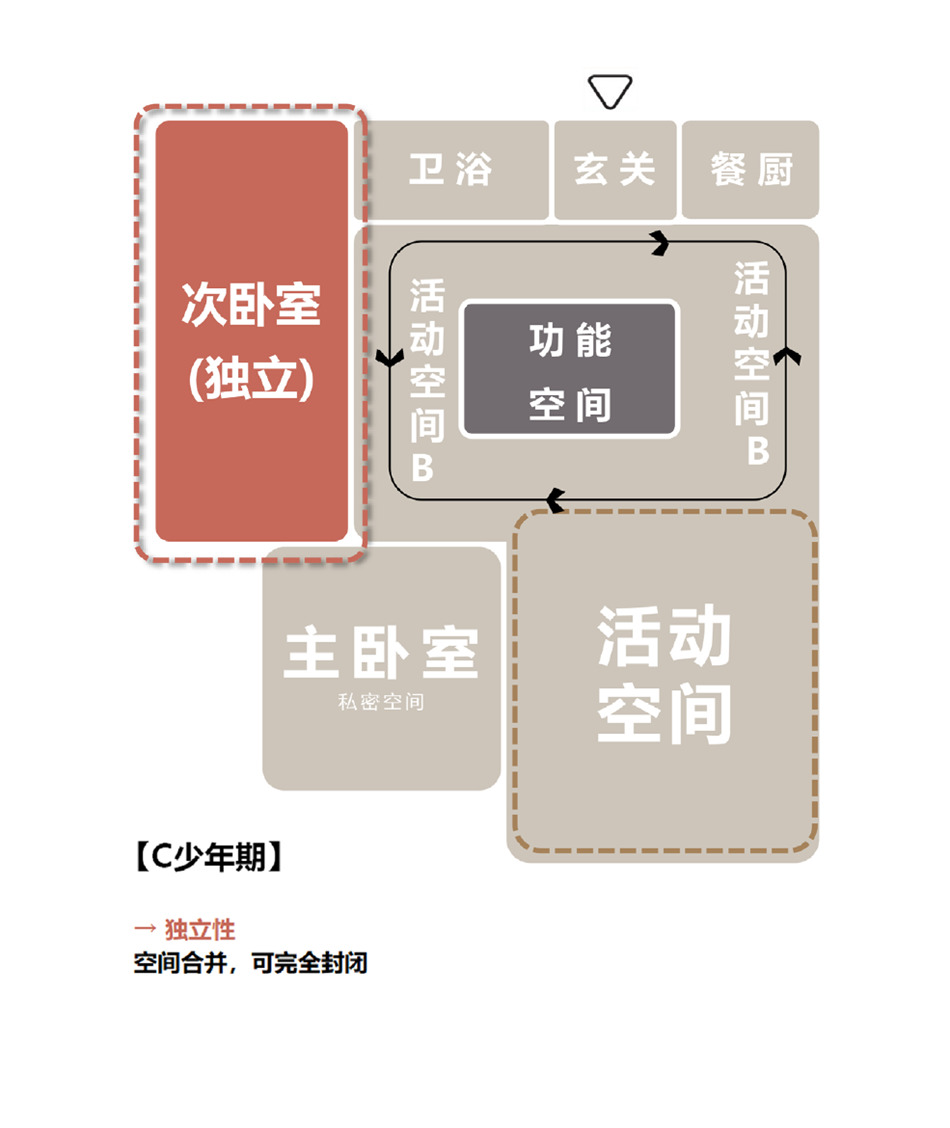 少年期,孩子开始有独立意识了,有自己的小隐私了,用两扇移门,就能把这三块区域合并为一个独立的次卧室。