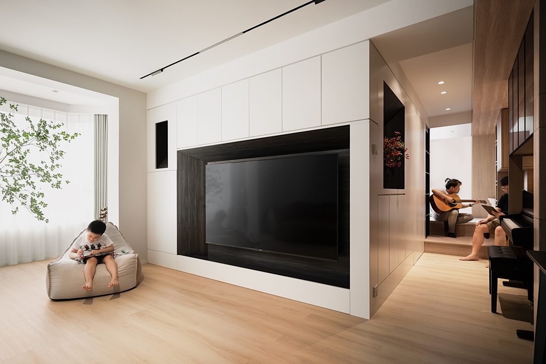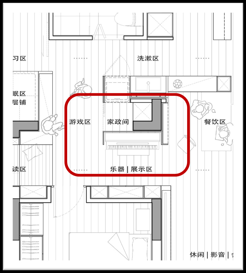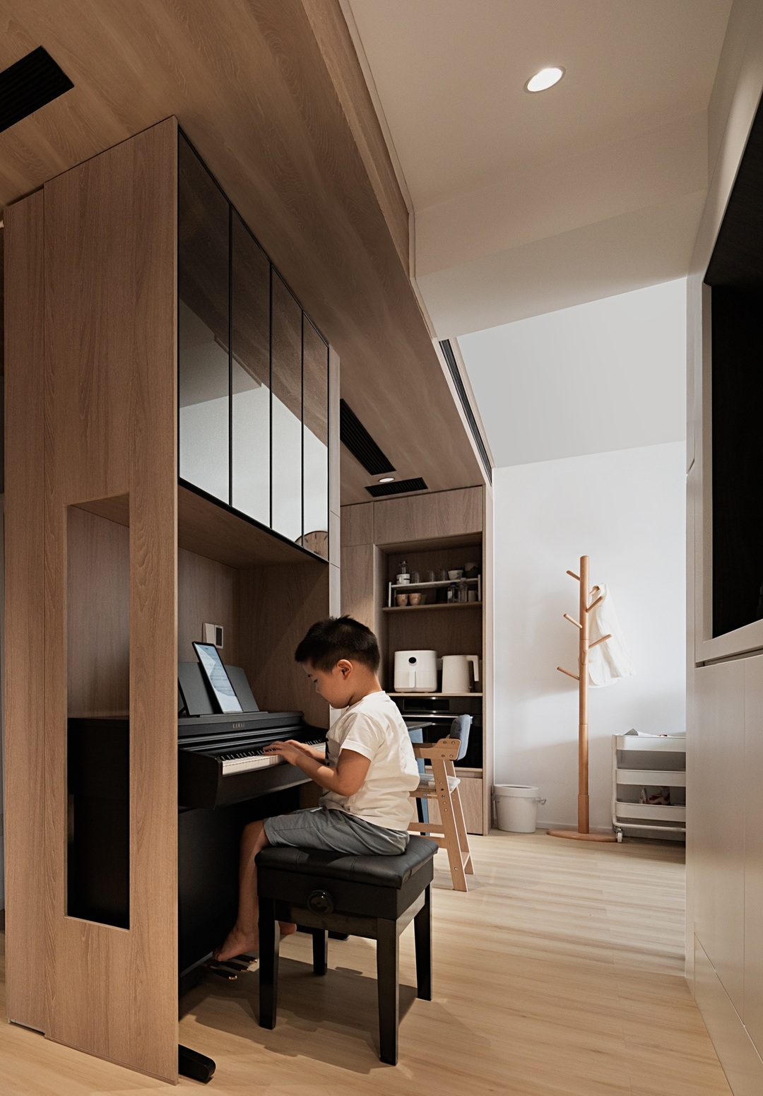承重墙后面,刚好位于全屋东西轴线的中心,是宝宝的练琴舞台。钢琴左右,正好衔接游戏区的地台和起居室的沙发,两侧皆是观众席。