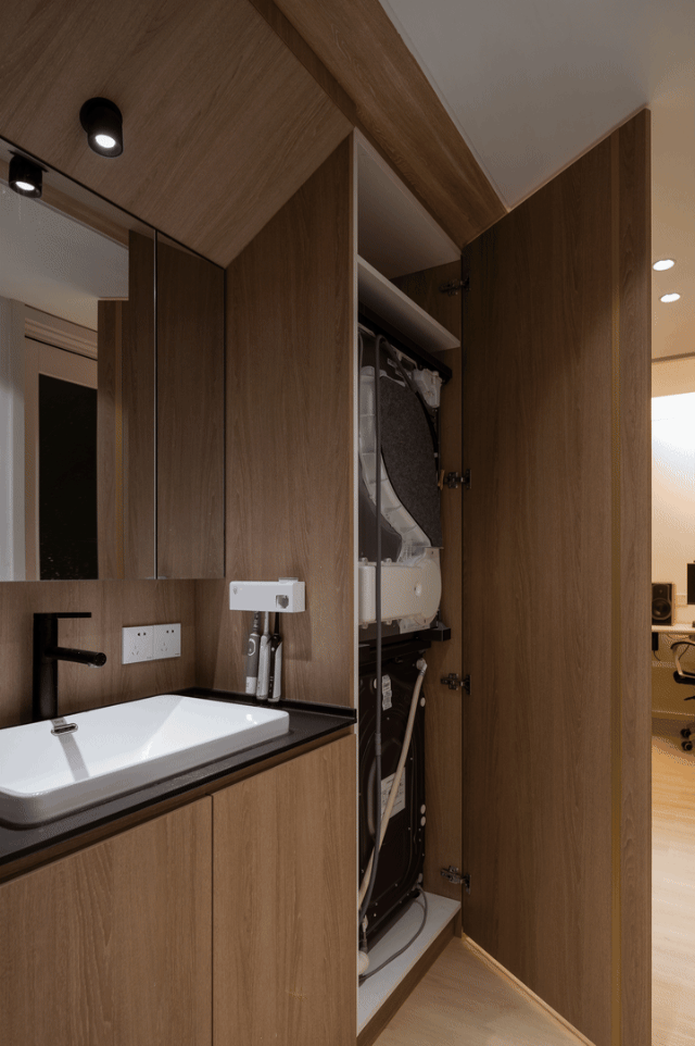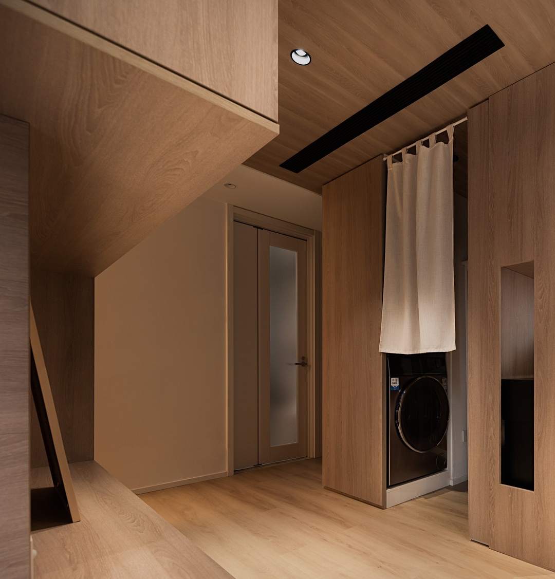 原本承重墙里的鸡肋角落变成迷你家政间,集结洗烘、扫地机器人、清洁工具收纳等等功能,背面还开了一个“后门”,方便未来洗烘设备检修。