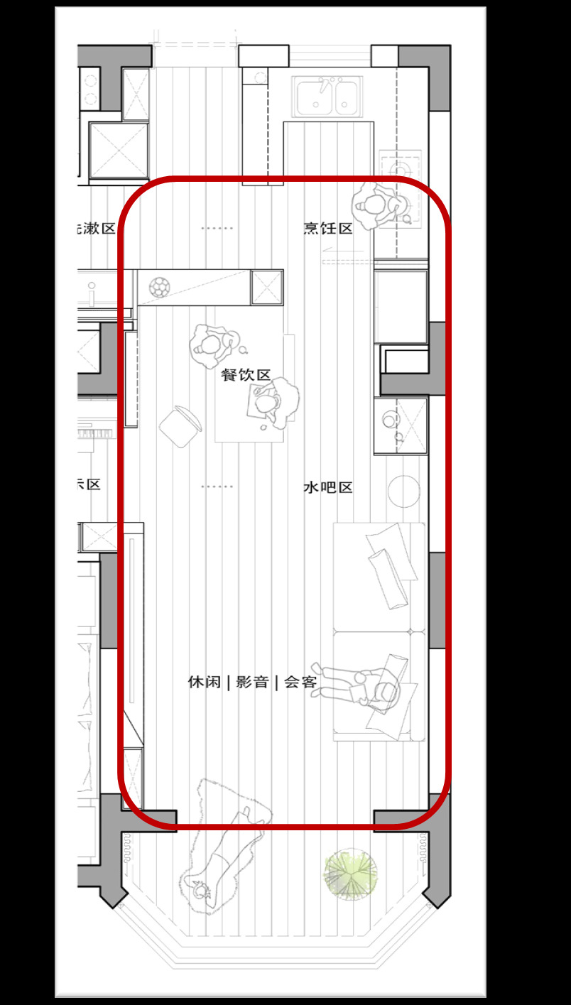 破,是打破了「房间」的限制,除了主卧、卫生间这样的私密区,其他房间的痕迹都消失了,取而代之的是一个又一个功能区。
