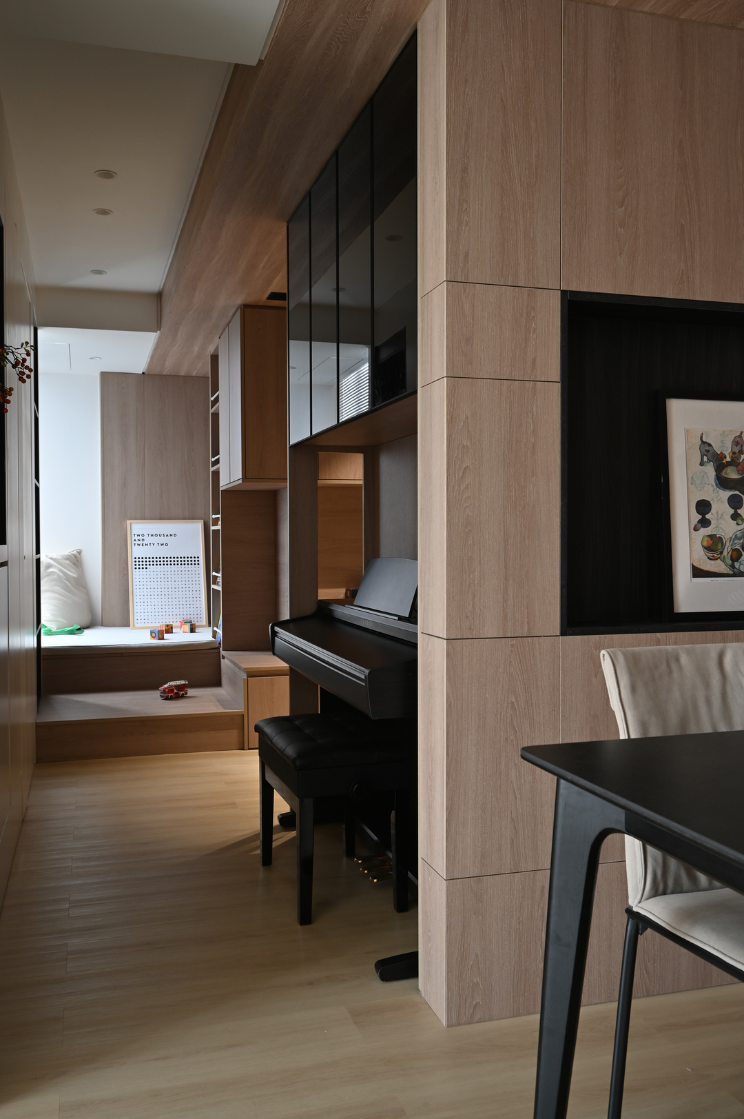 爸爸喜欢乐高、拼图、手工,钢琴上方就是一个展示区,可以放爸爸的作品,当然,家里还有好几处开放格,同样用来陈列男女主人喜欢的东西。