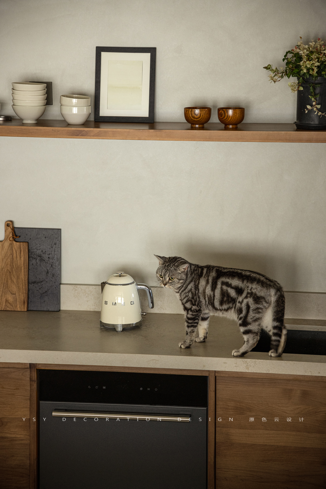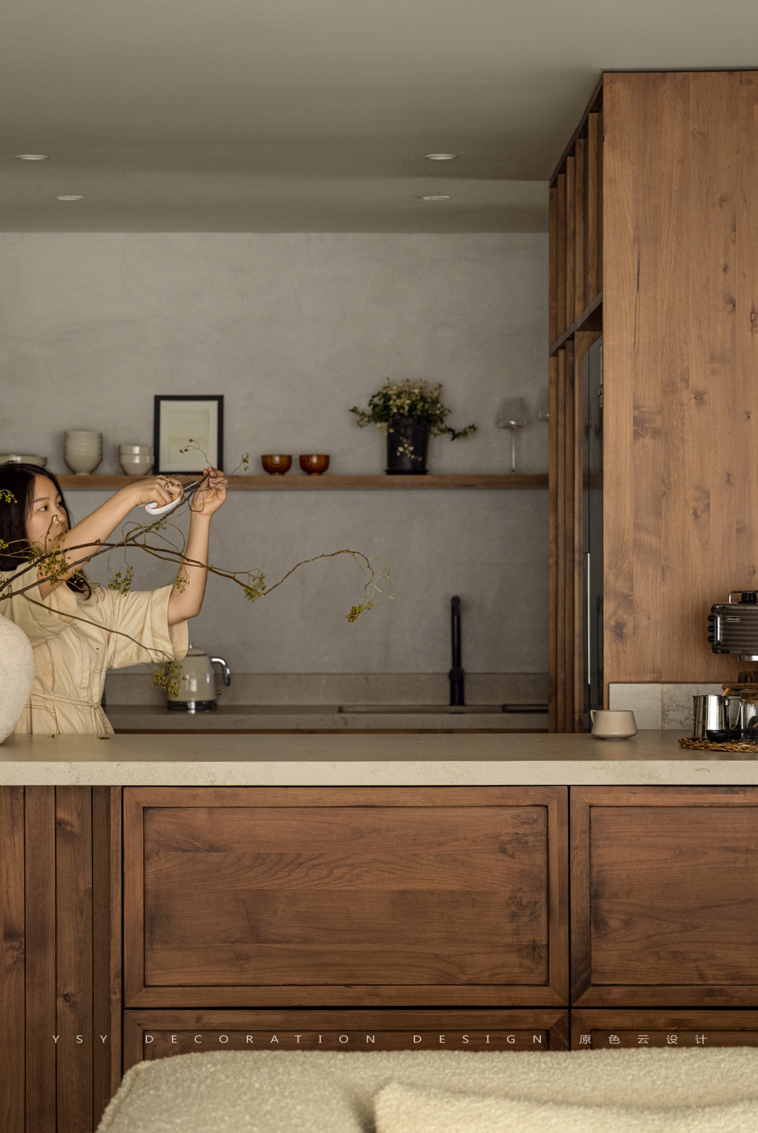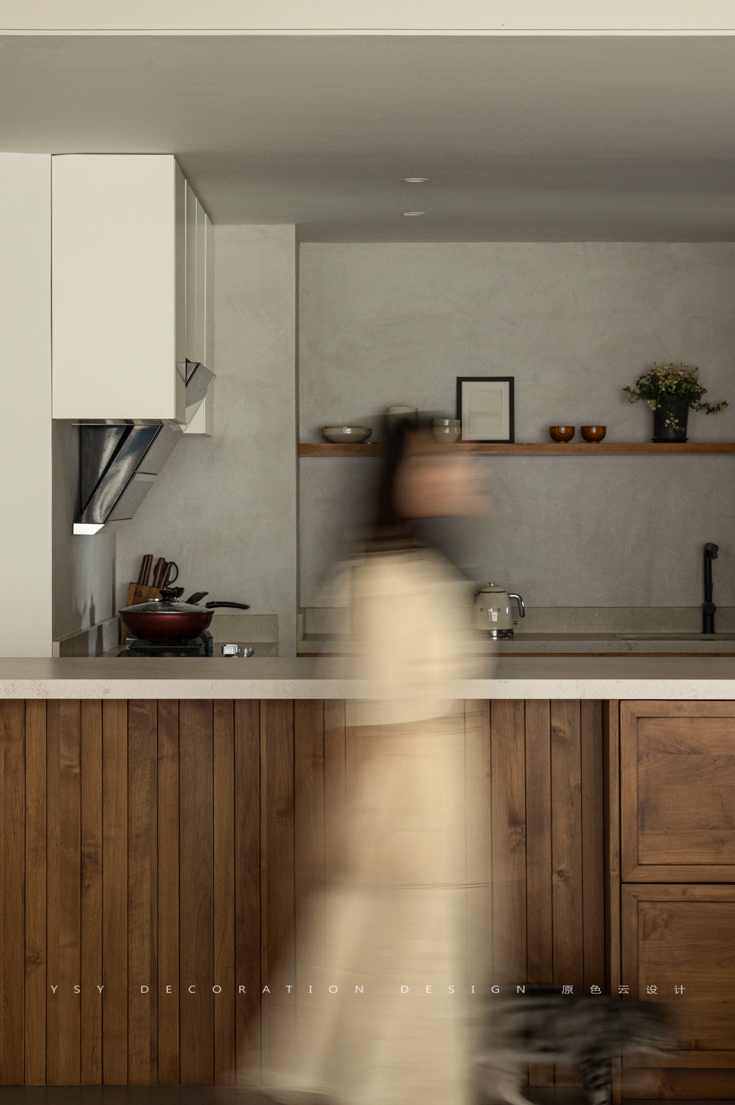 地面用裸色系微水泥大面积铺开,厨房墙面用艺术涂料代替传统的贴砖方式,不仅从视觉上实现墙地面一体,更保证了肌理与质感的统一,更是将烟火气藏匿在艺术感的追求中,享受纯粹生活。
