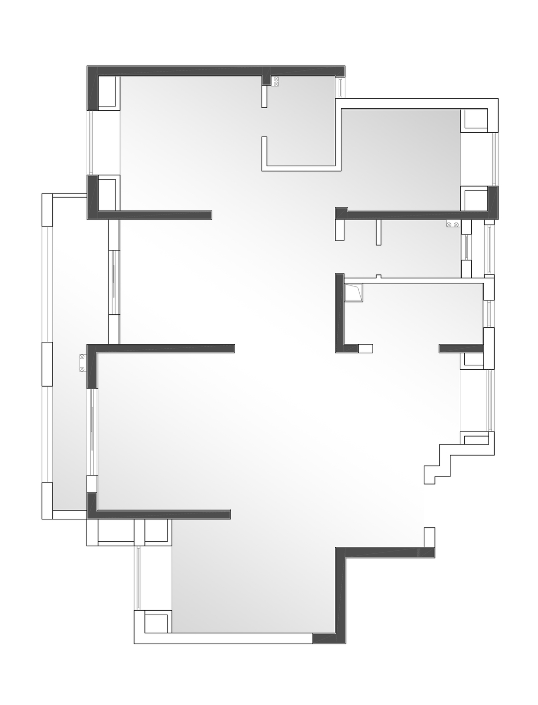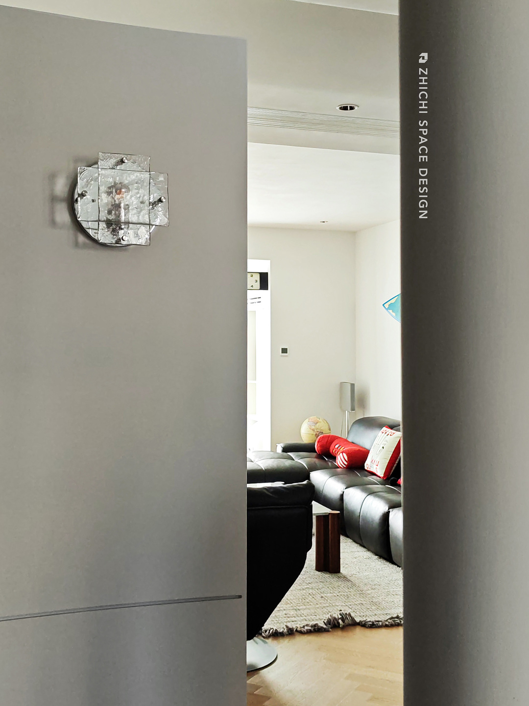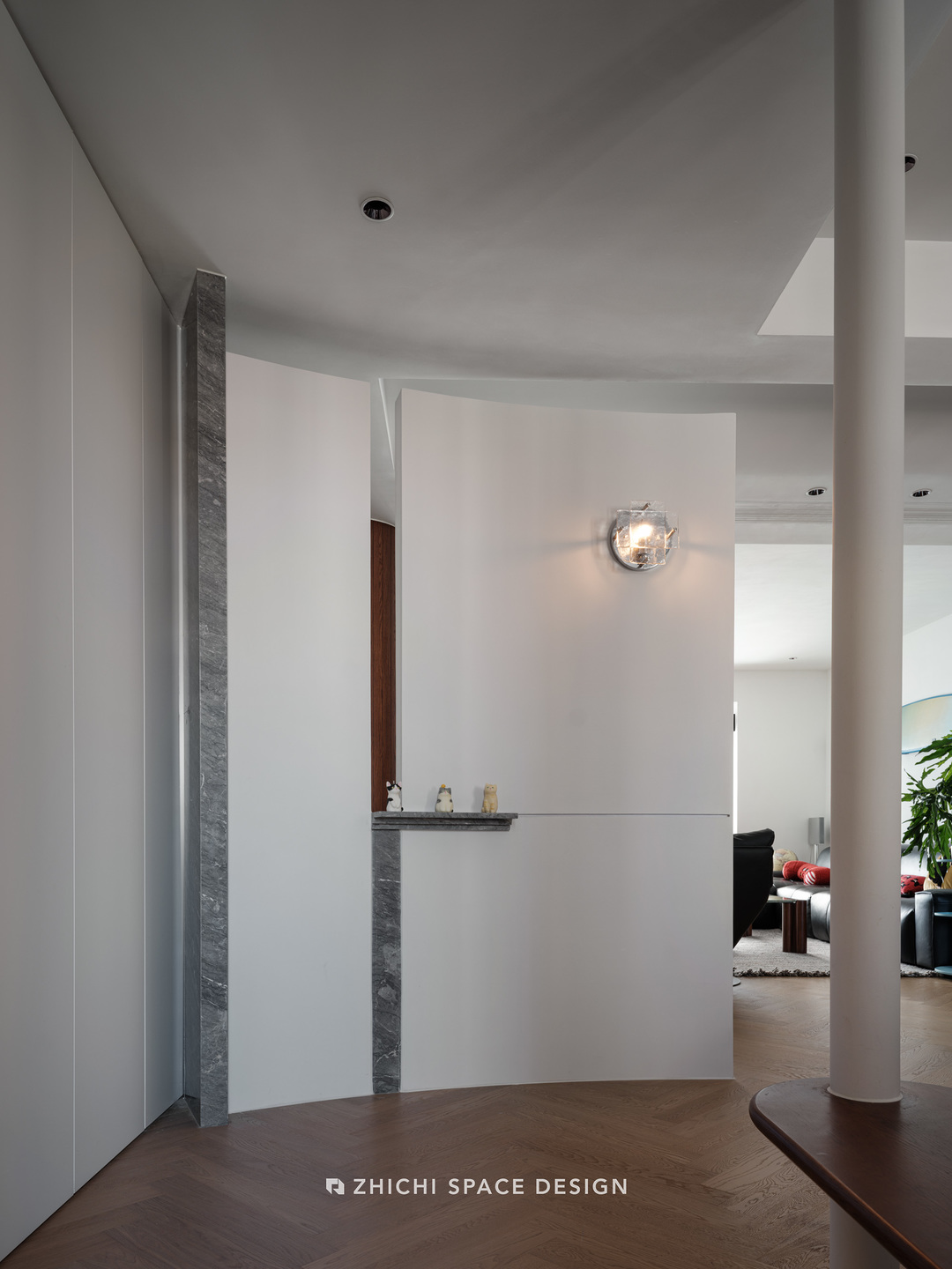 入门处的弧形隔断,是屋主最心动的一笔。它阻挡视线,避免平铺直叙;大面留白中,一盏灯光温柔晕开,引导视线向右,步入色彩更浓、视野更开阔的公区。