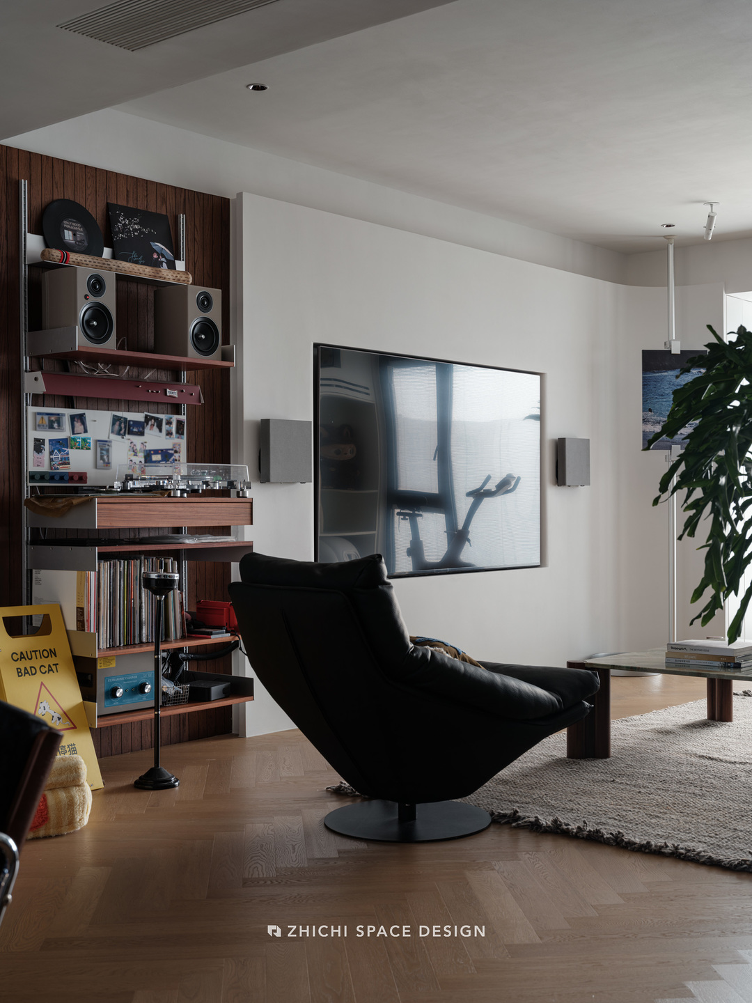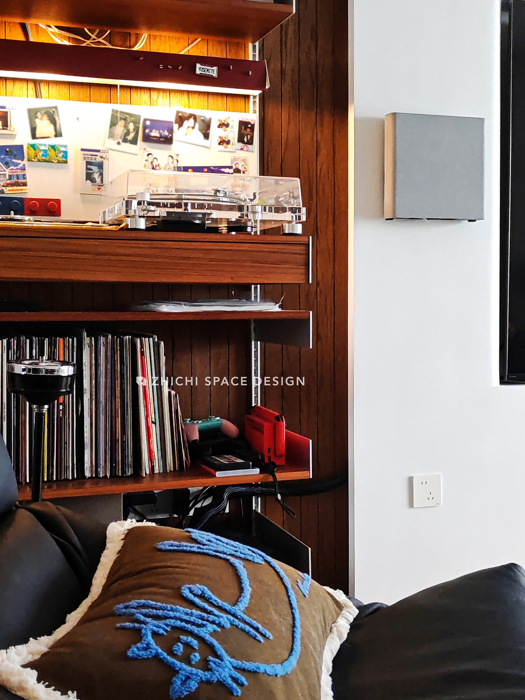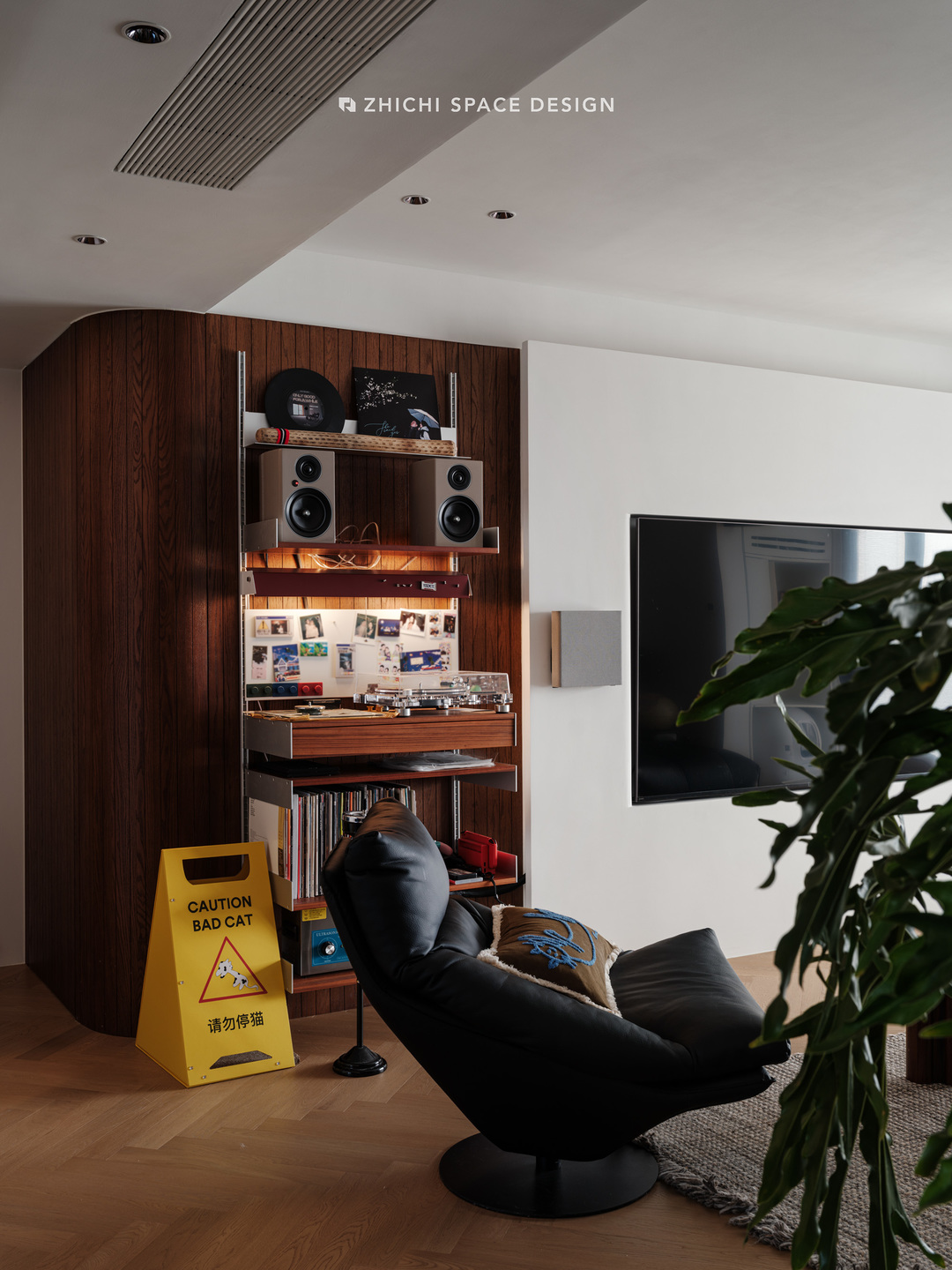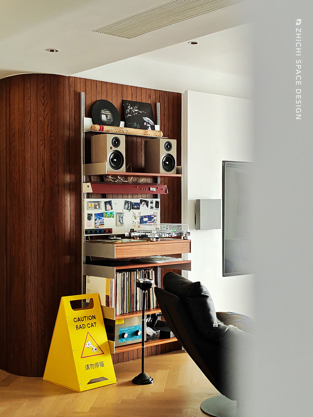 屋主喜爱“满满当当”的生活感,客厅硬装唯一的重色在电视墙转角处,L形木色体块将客卧藏于身后,一组黑胶架沉淀着屋主对音乐的深沉热爱,唱片、音响、拍立得……热爱的事物成了空间最好的装饰,进入这个家,就能直观感受到居住者的个性。