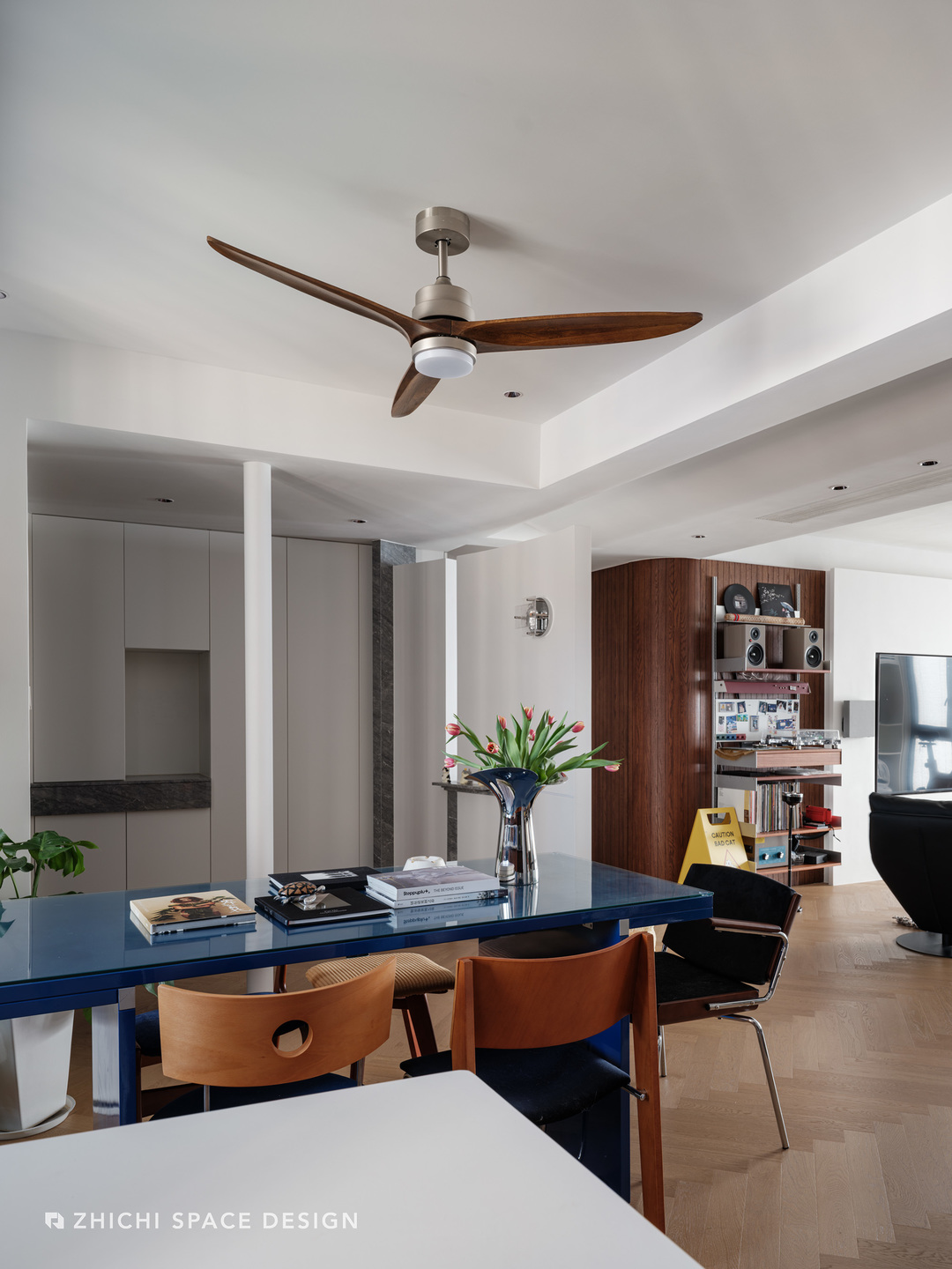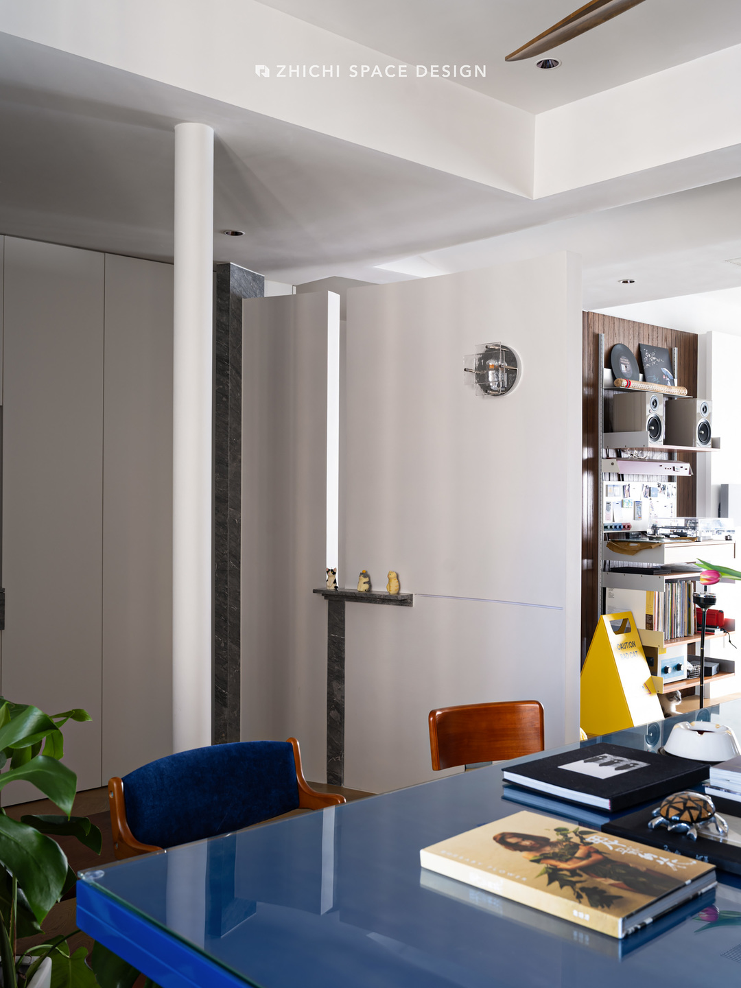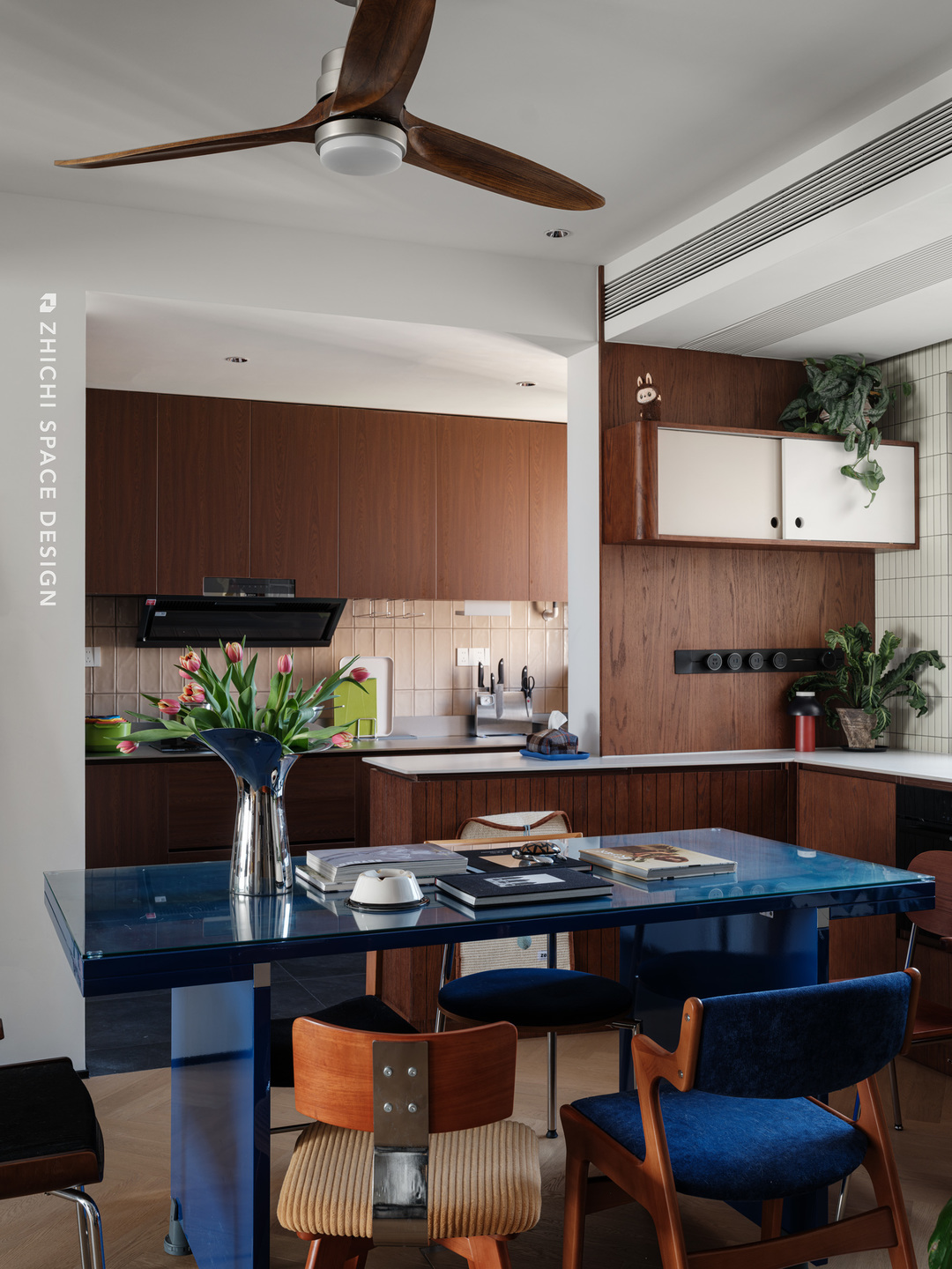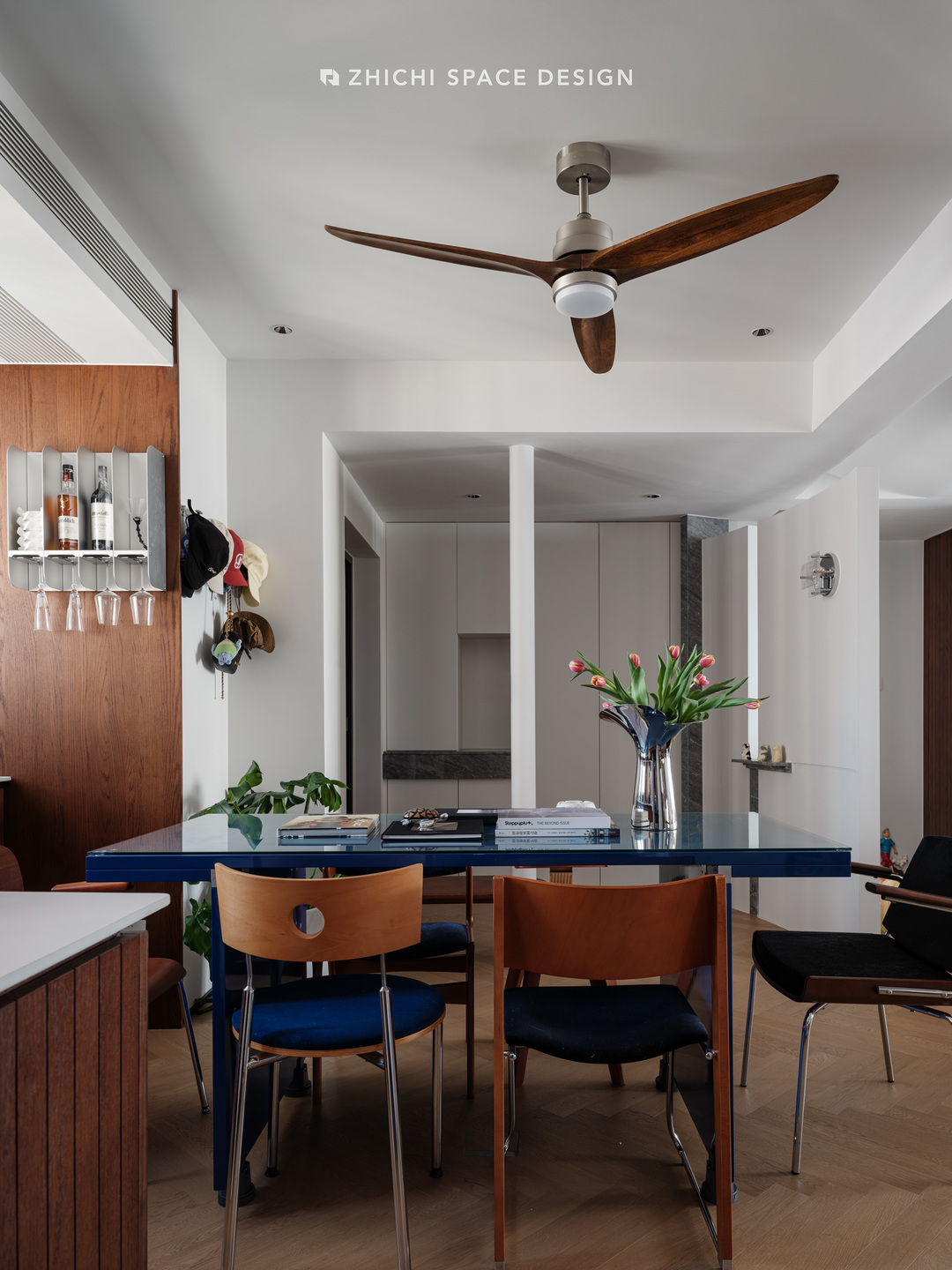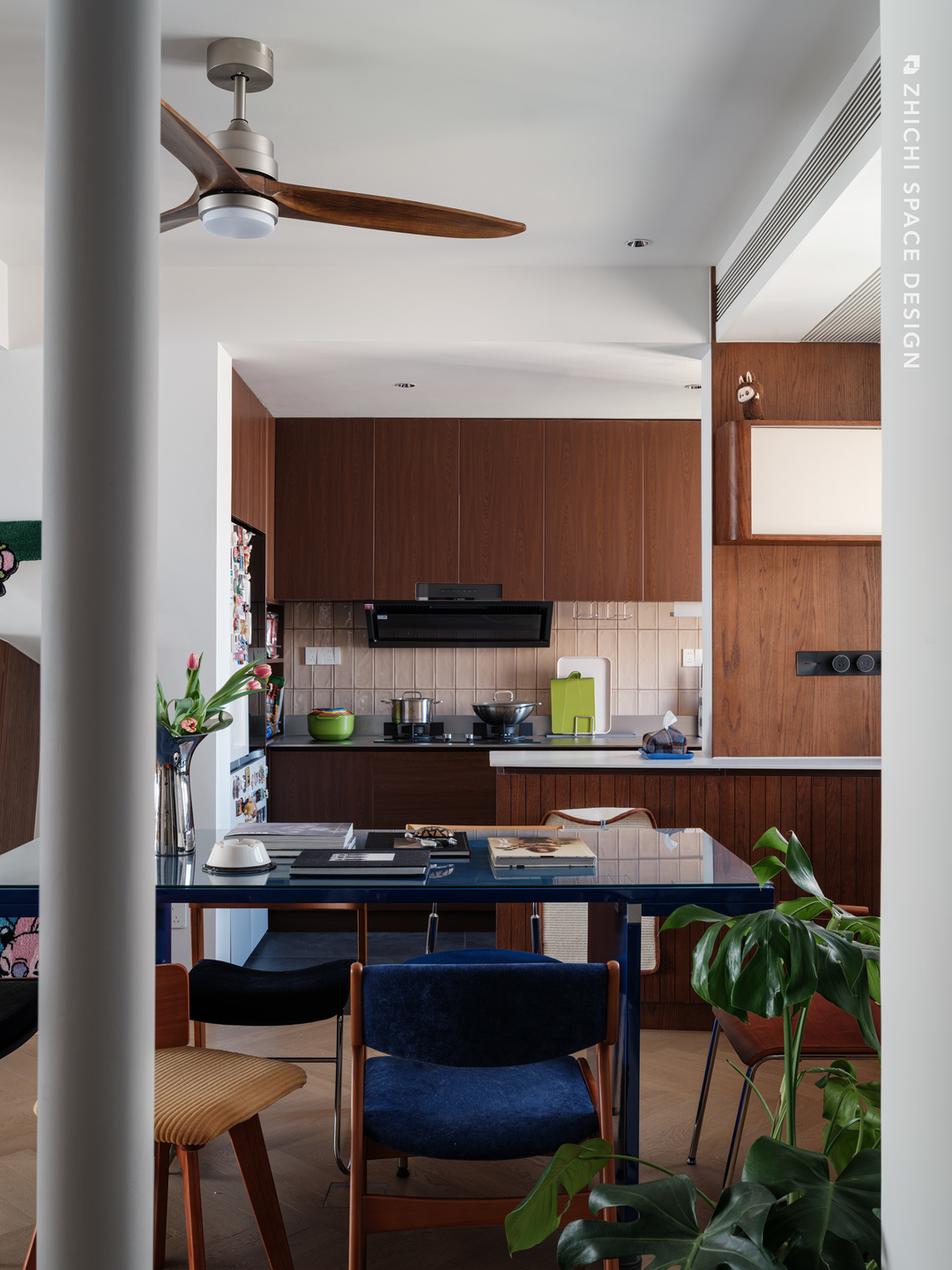 餐厅与玄关之间以换鞋凳分隔,一根立柱,明确了空间功能。几把造型各异的餐椅围绕在宝蓝餐桌四周,但更值得注意的是餐厅与开放式厨房之间的关系。