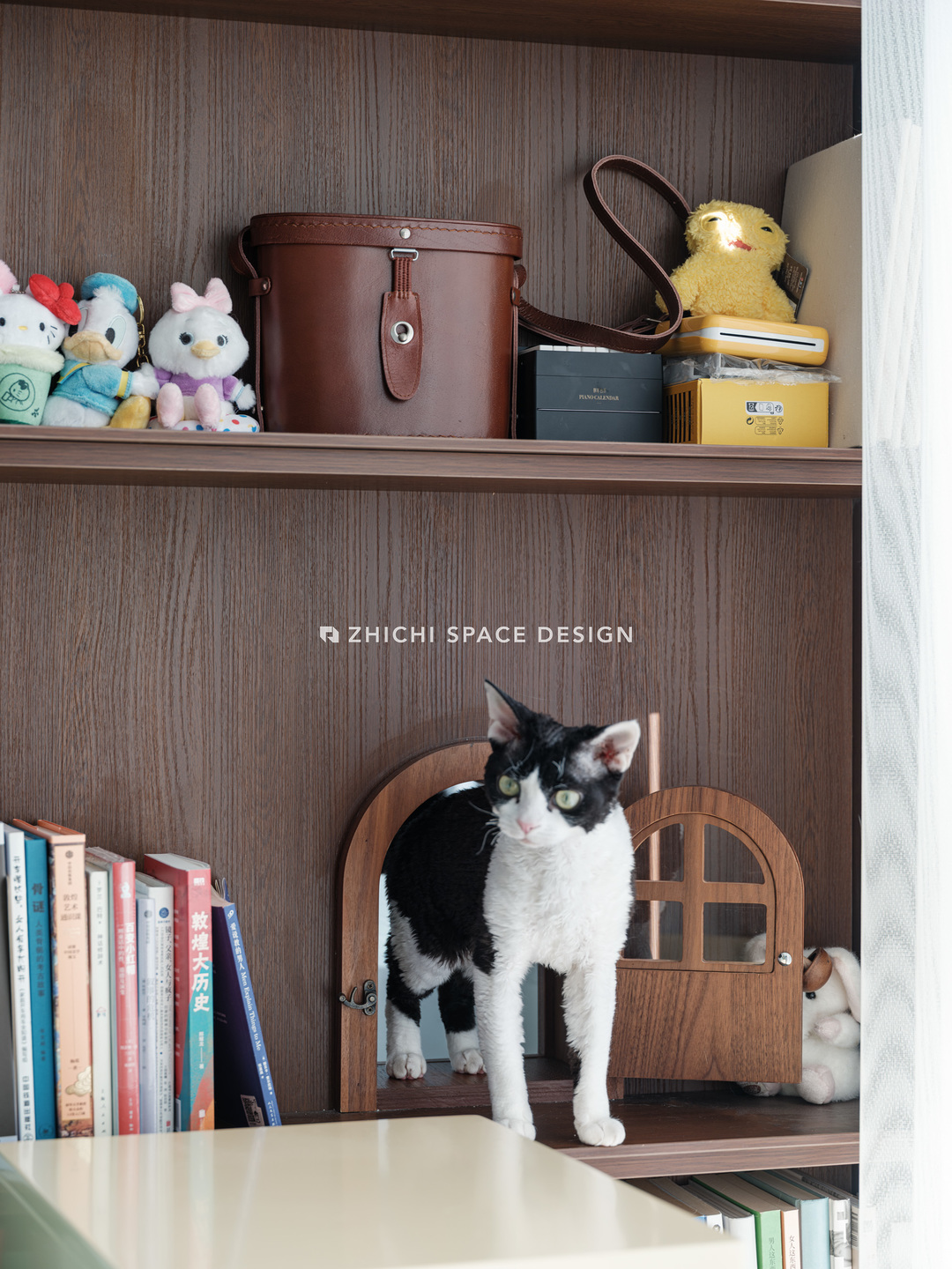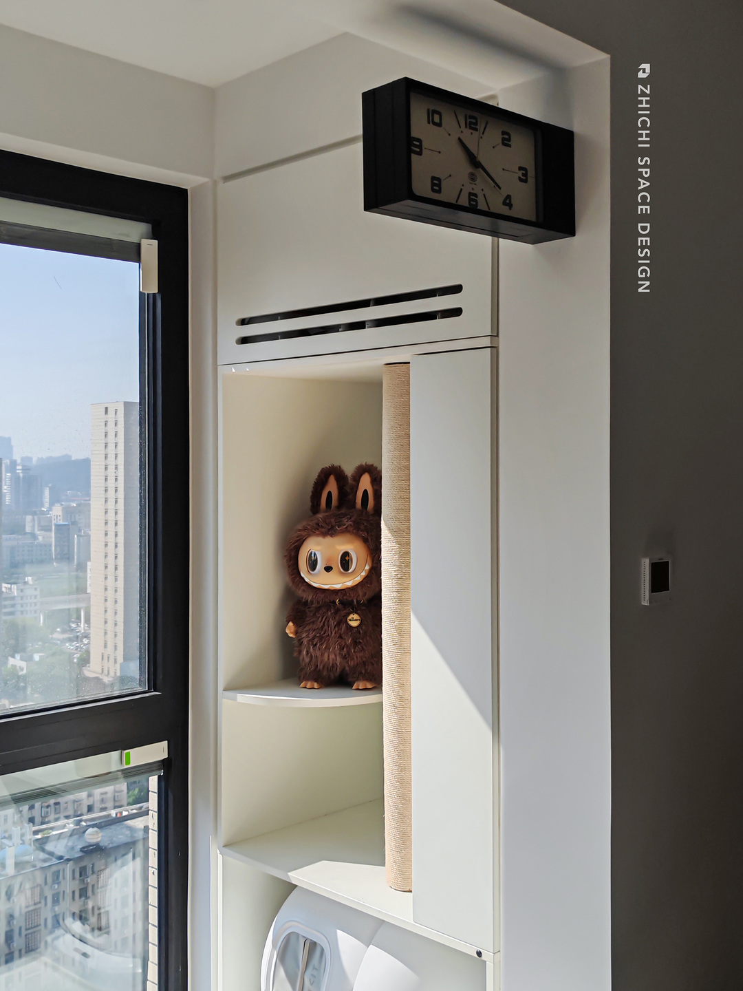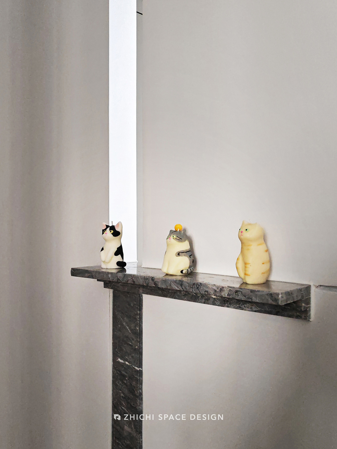 隔断中间嵌有小石材台面,摆放着屋主结婚时的伴手礼,也是家中三只猫咪的“化身”,细节中见温情。
