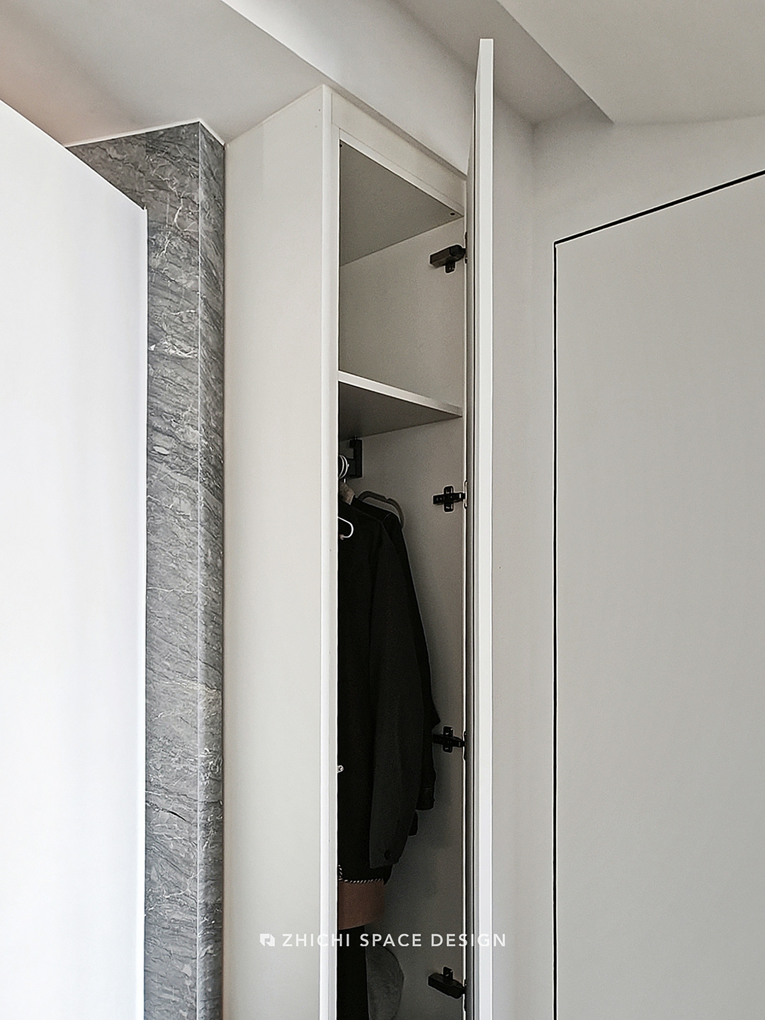 隔断的弧度故意截断整排鞋柜,留出一组从隔断后方开门,这是用来临时挂衣的区域,避免视觉杂乱,而且在它旁边,还有一个储物间,底部留了通风口,方便透气。