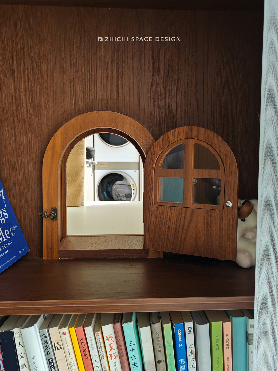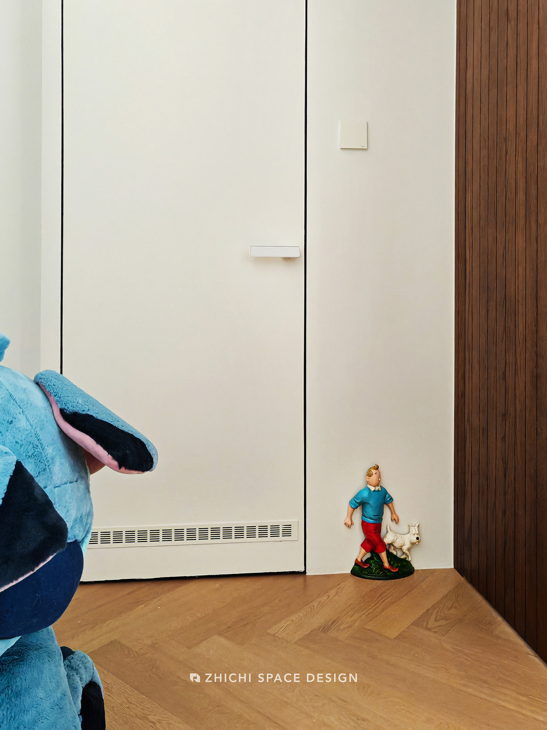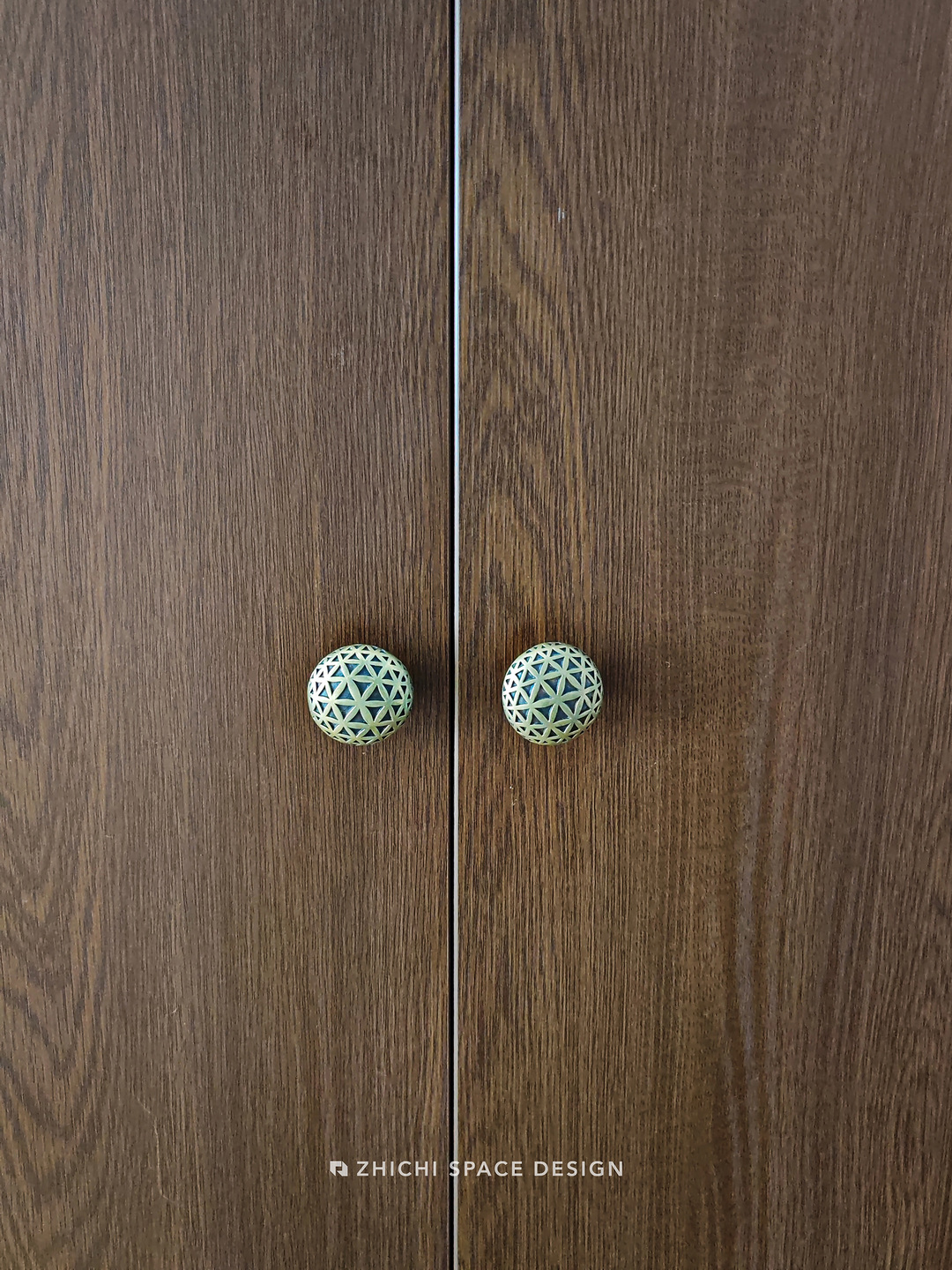 走廊尽头的一面木色并非单纯的装饰墙体,它与杂物间一样承担着公区的收纳重任,既是家政柜,也是零食聚集地。值得注意的是这四个小小的金色门把手,它们是屋主去印尼逛街时带回的,用在这里正合适。