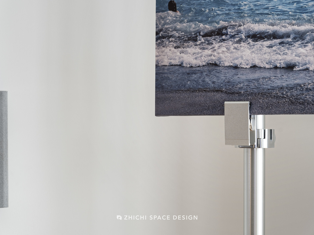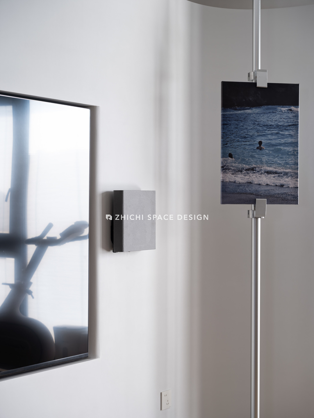 客厅角落的天地架并非单纯的装饰,屋主喜爱摄影,这里展示的就是他打印出来的得意之作,日后也能经常更换。并且在顶部还专门配了一盏切光灯,打造出博物馆、美术馆般的效果。
