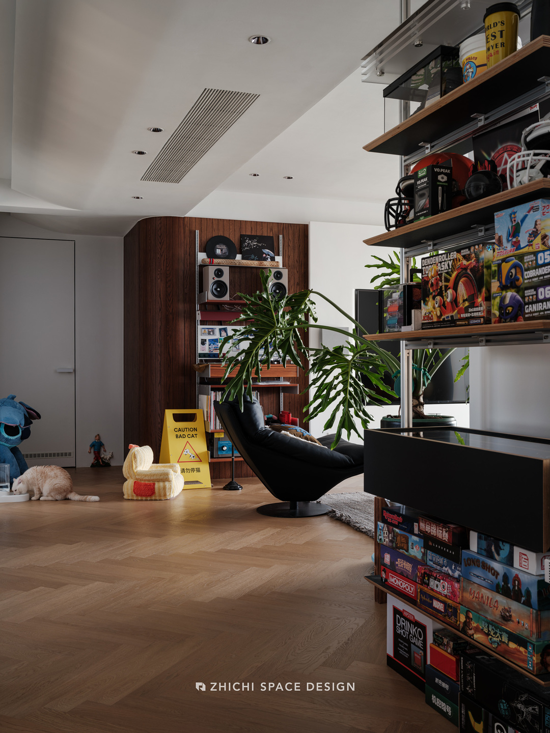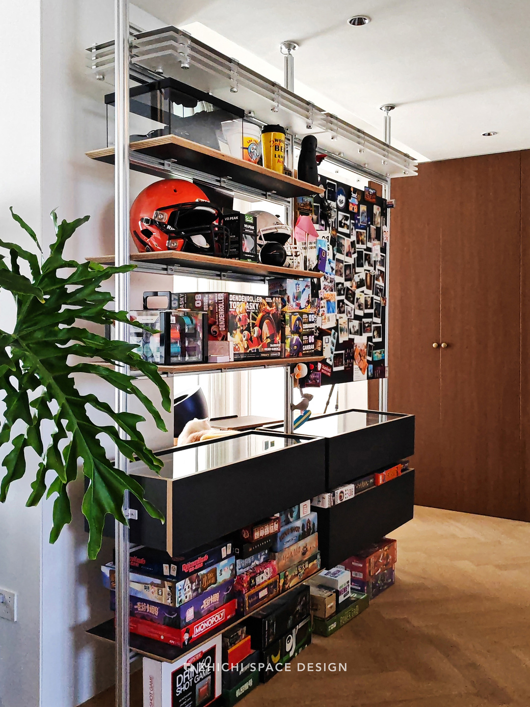屋主常邀朋友来家里玩桌游,开始还不知道桌游放哪合适,后来发现堆在架底刚刚好——设计,本就该随生活习惯自然生长。