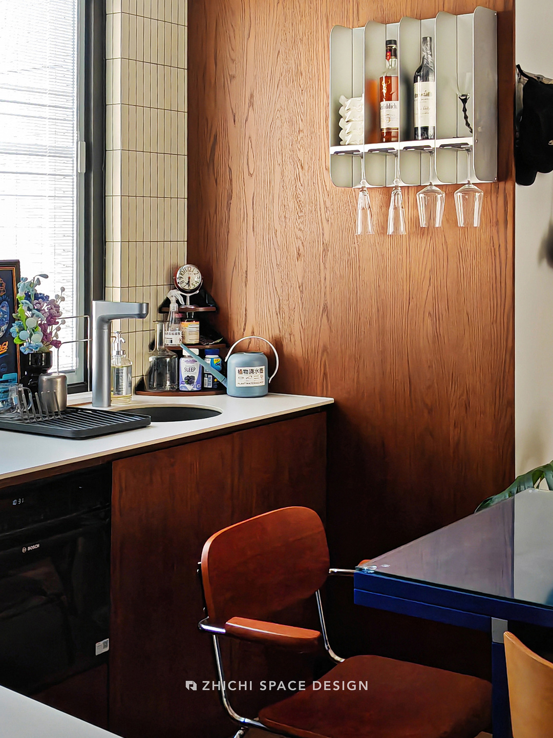 除了大量地柜,空间上方也利用了墙面安排了各种收纳,吊柜储存杂物,酒架展示几瓶常喝的酒,一排挂钩负责收纳帽子包包,它们不仅是功能性的存在,也丰富着空间层次。
