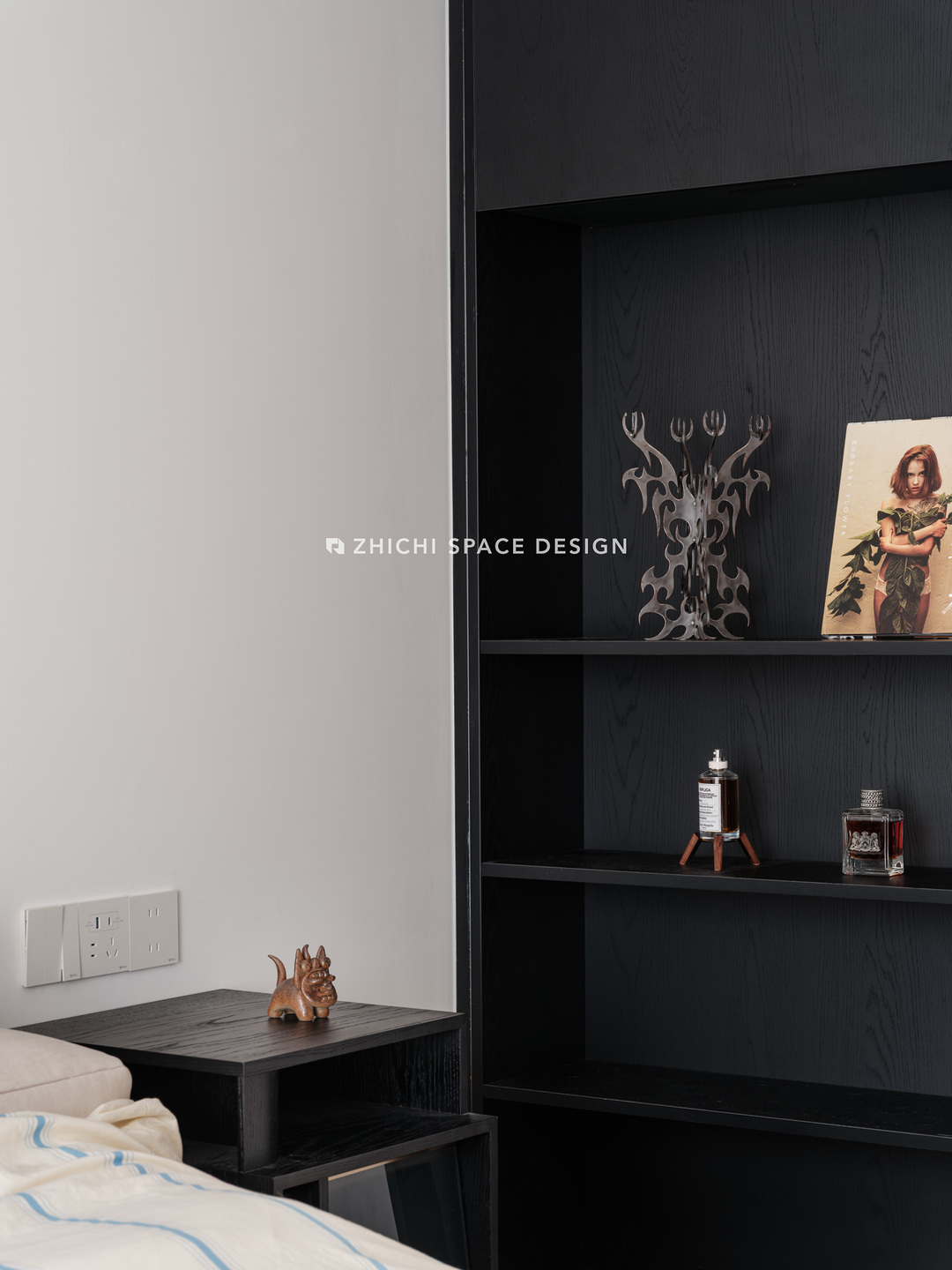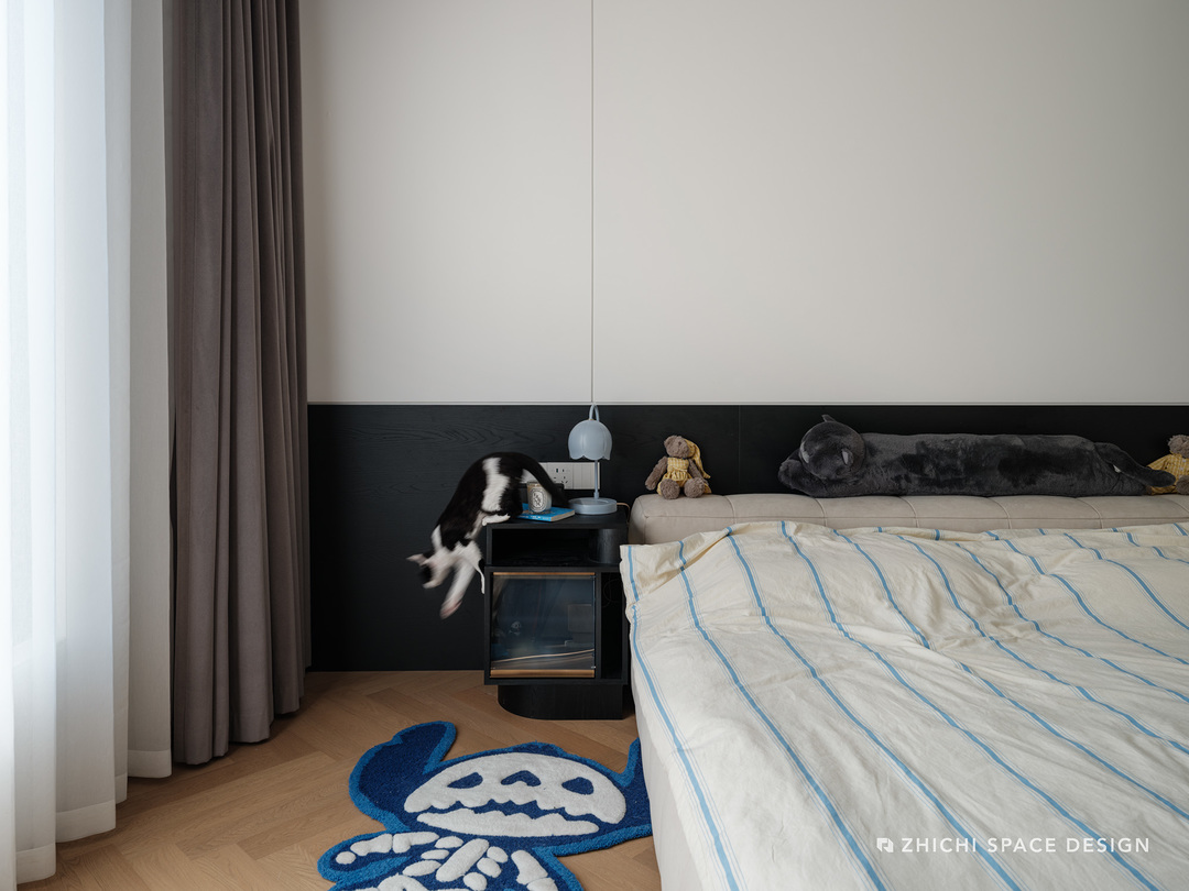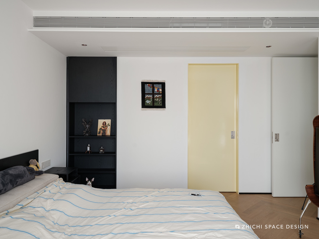 相比公区的热闹,卧室安静了许多。床头的黑色传递冷静,黄色口袋门依旧张扬个性。