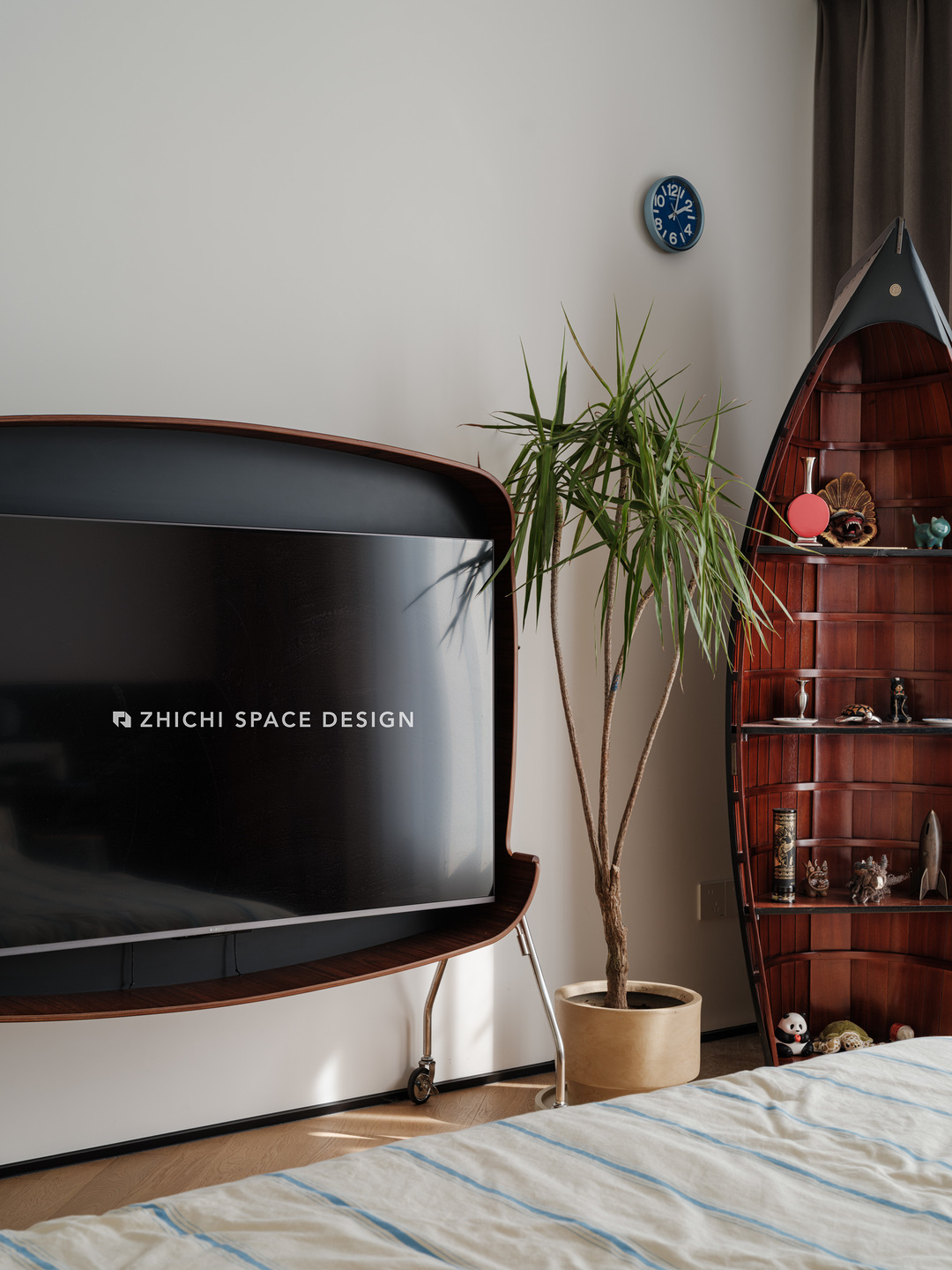 这个家的主心骨就是这个电视架,屋主一眼就爱上,特意去北京订购回来。旁边船型展示柜,陈列着旅行带回的纪念,每一件物品,都是生活的注脚。