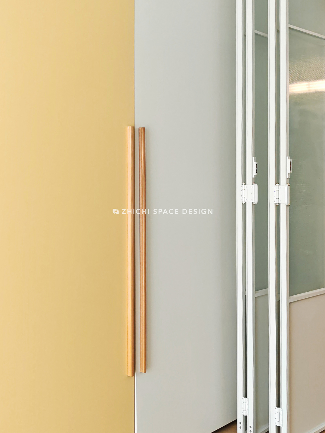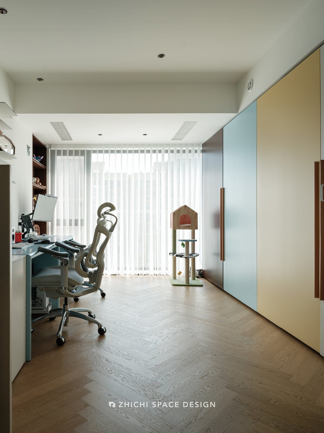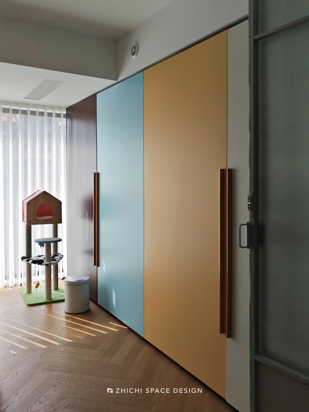 而且这里日后也可灵活改动为儿童房,一面彩色巴士移门柜子负责衣物收纳。柜门颜色也与屋主沟通过很多次,既想要缤纷色彩,又不希望办公空间太过吵闹,这组柔和的配色刚刚好。