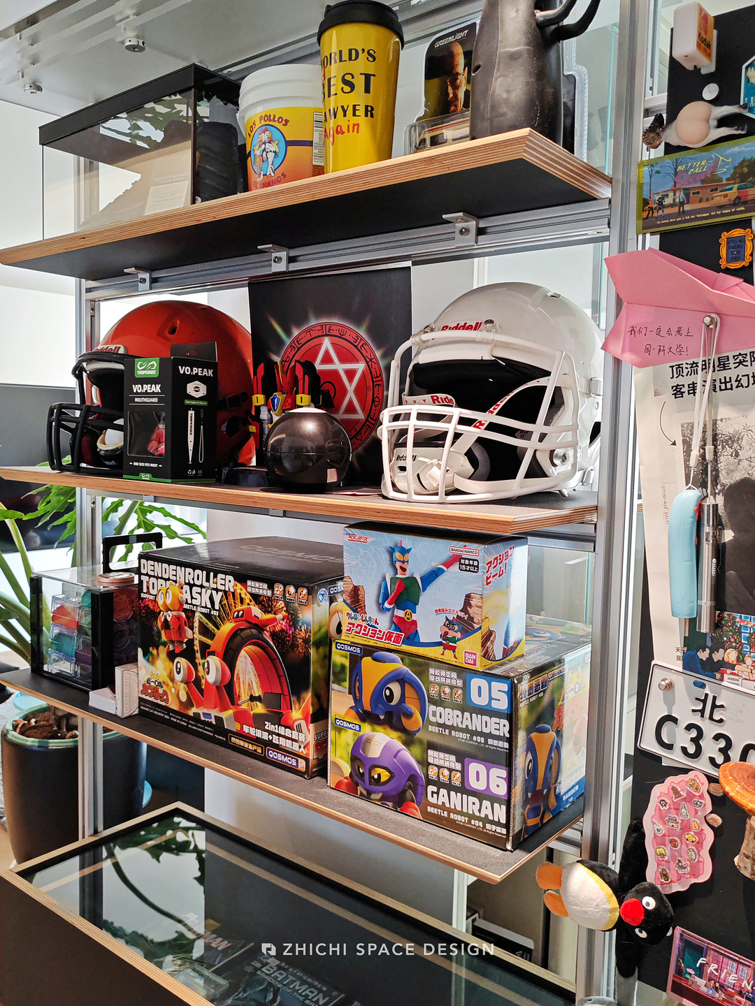 定制天地柜中,陈列着十年前的头盔、朋友赠礼、海外拍回的球鞋、旅行纪念……相机与漫画珍藏于黑色柜体中,井然有序。