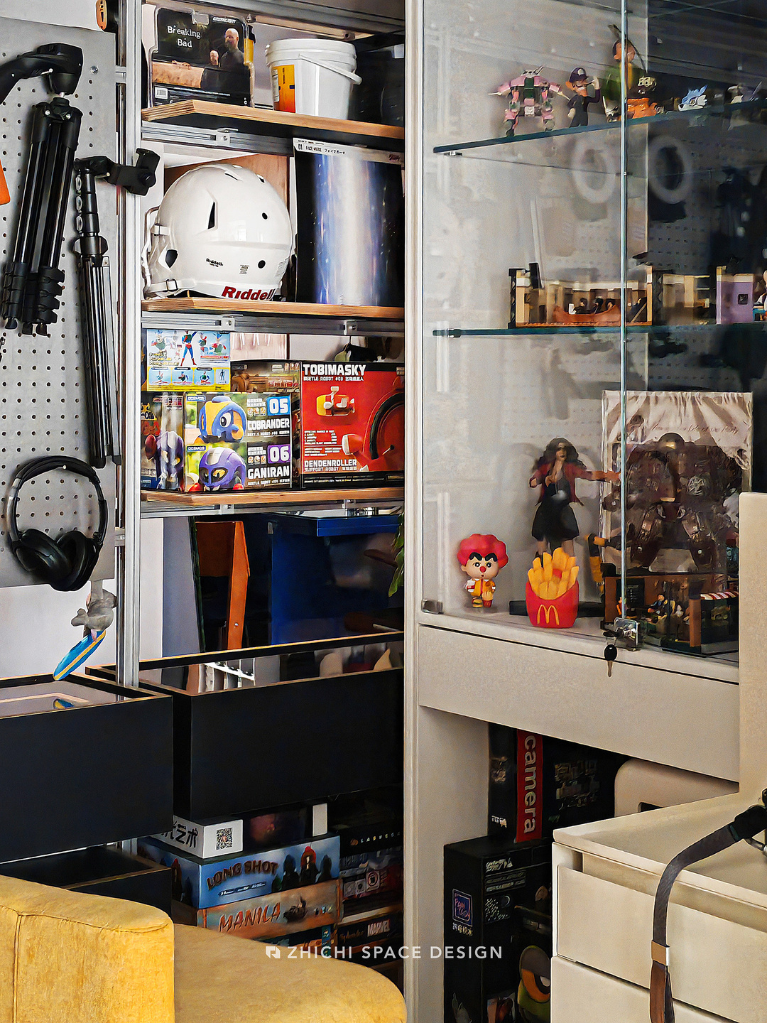 来到背面,是用4㎡打造出的一个秘密手办基地,洞洞板挂常用器具,玻璃展柜配顶部灯膜,内置蓝色系玻璃砖背板,灯光下更显通透。屋主都说男生朋友来到家里看到这组展柜,都投出了十分羡慕的眼光。