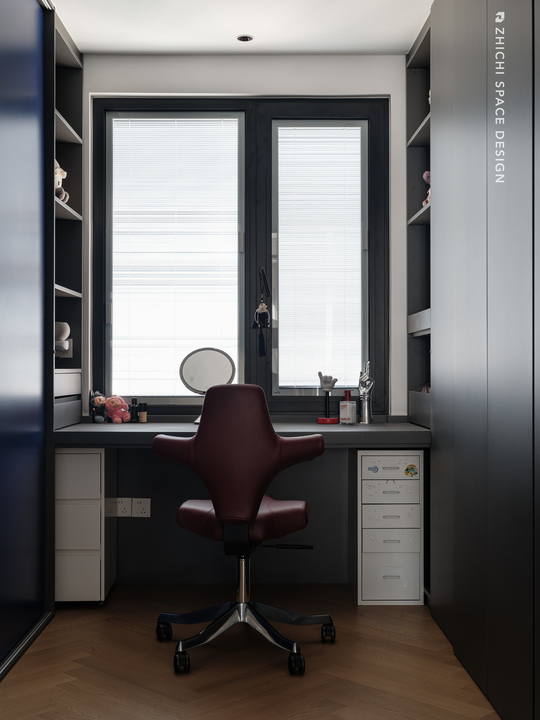 与手办区相连的是书房,折叠玻璃门掌管空间开合,打开即形成开放式办公区,双人办公绰绰有余。