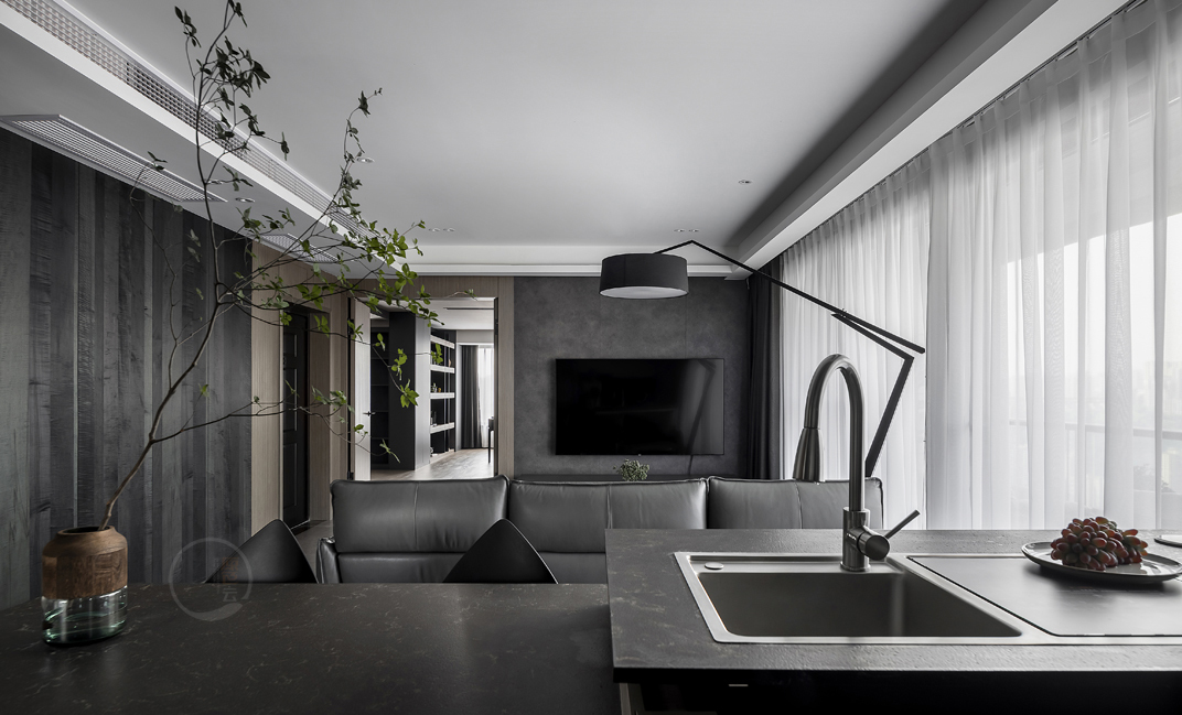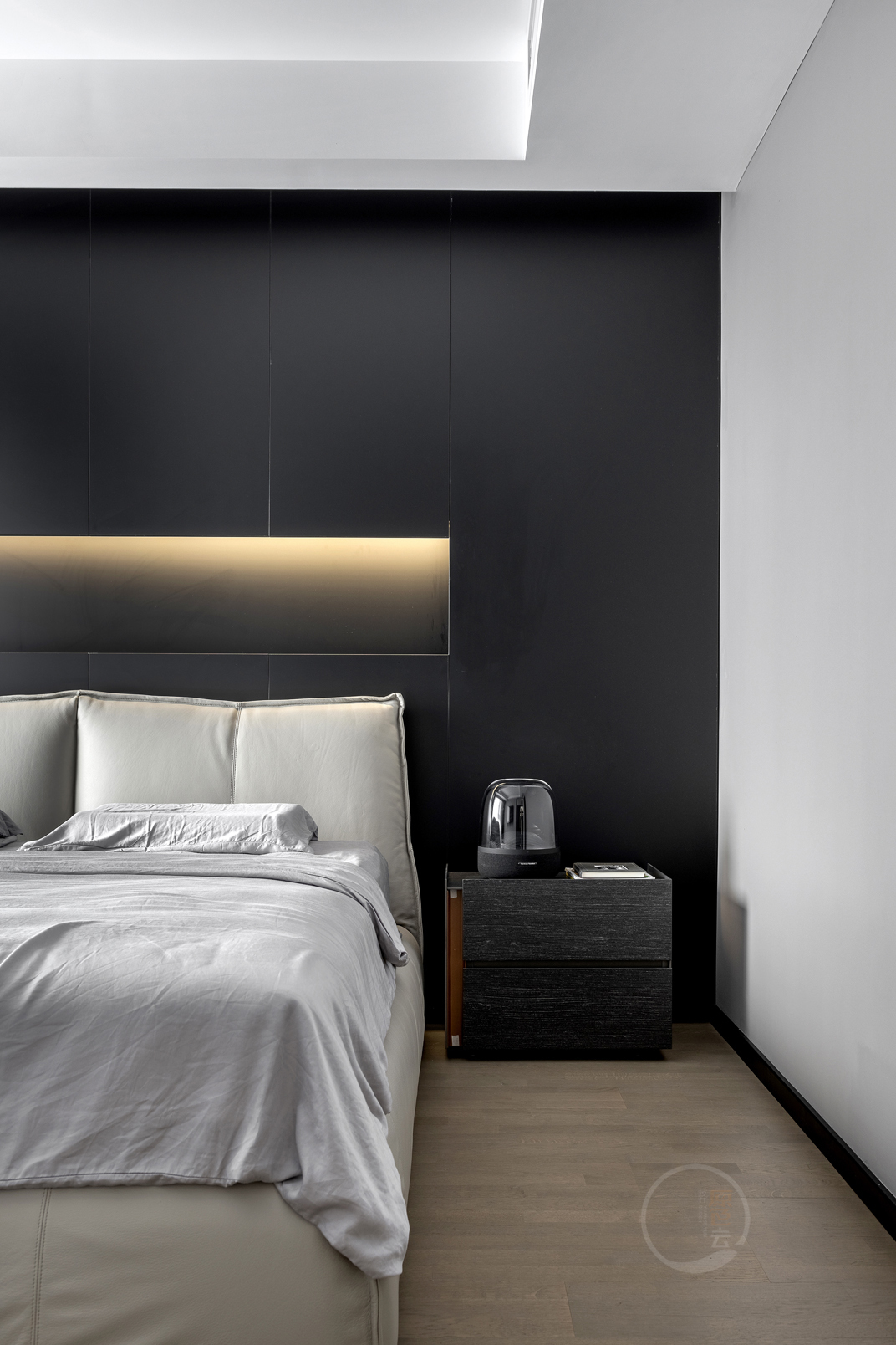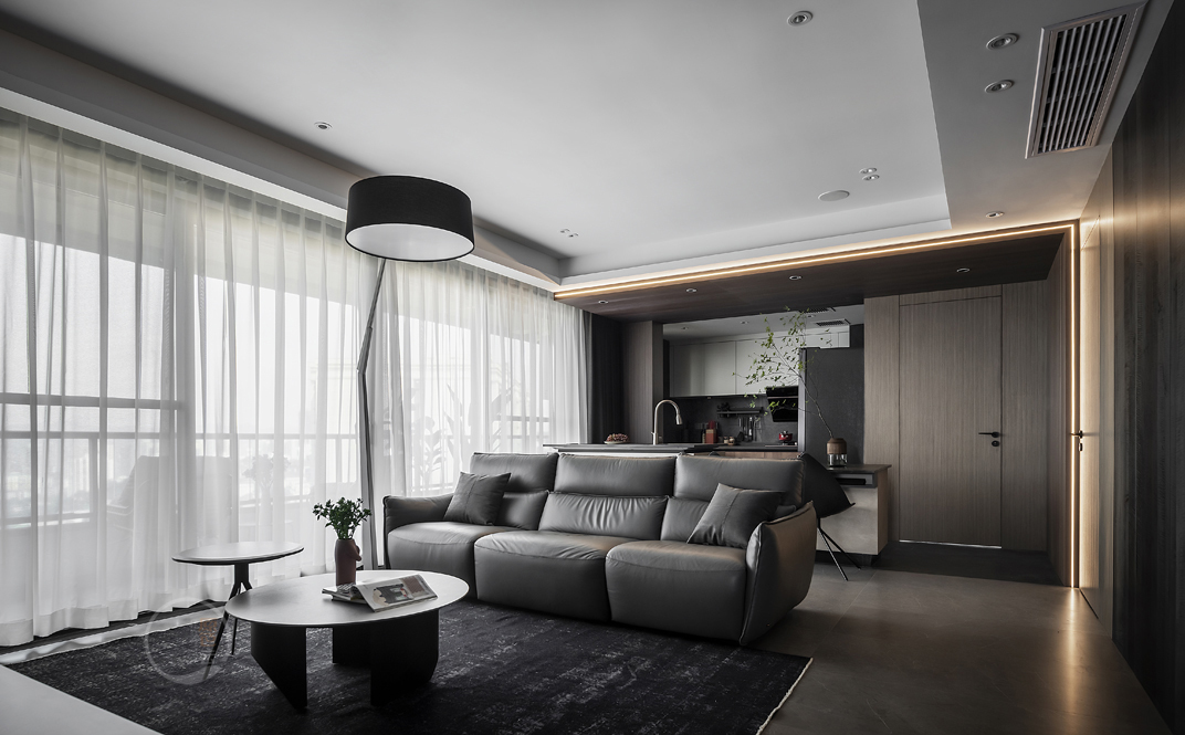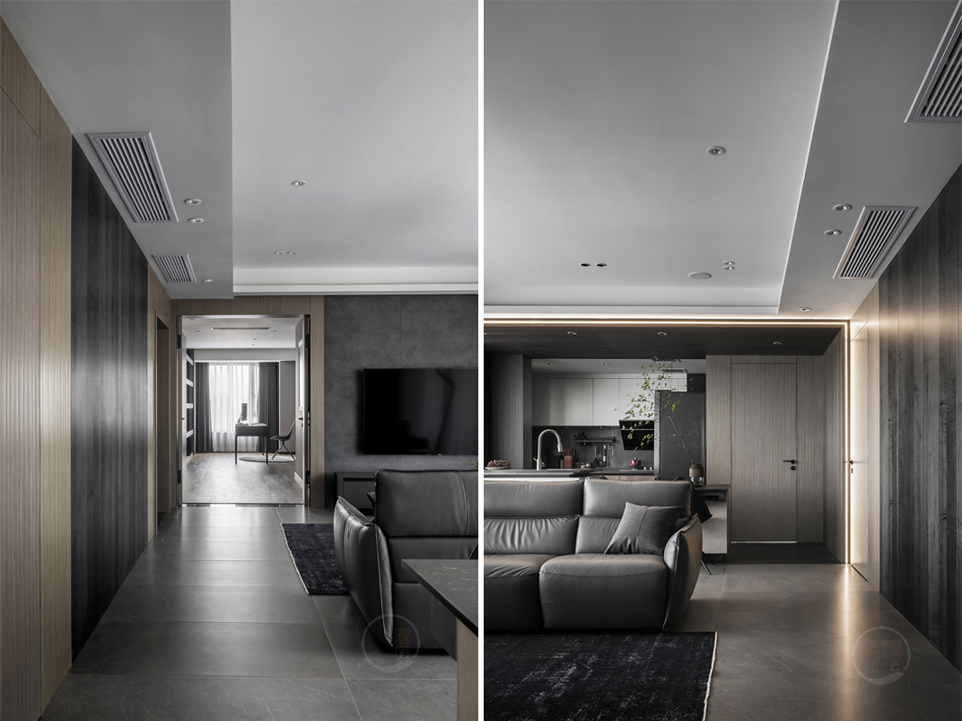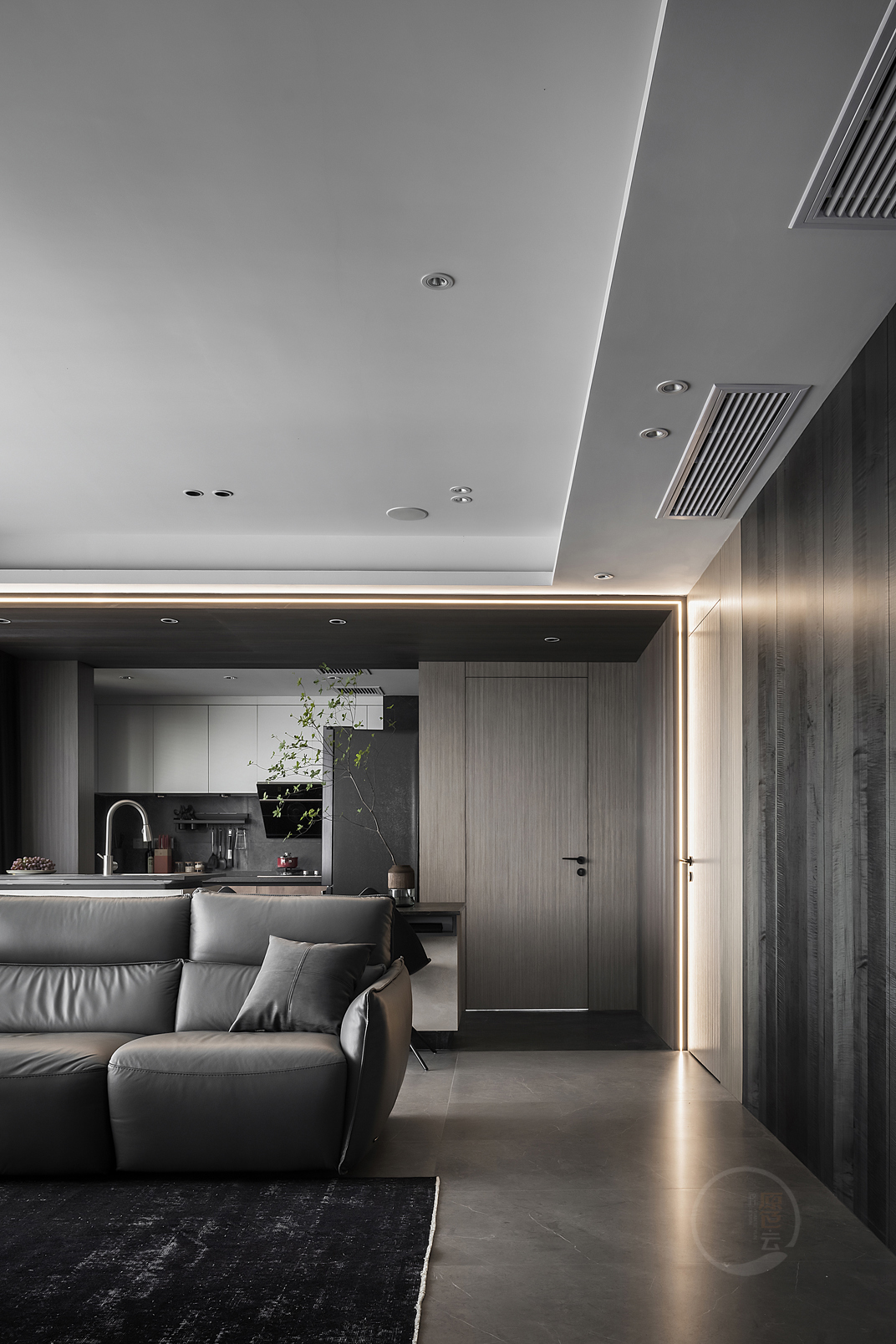 踏入完全开放的空间,现代主义的设计手法,无主灯设计,以简洁到极致为追求;整体黑白灰色调,木饰面、皮革、岩板元素结合,空间被体验,联结,美感也保持同步