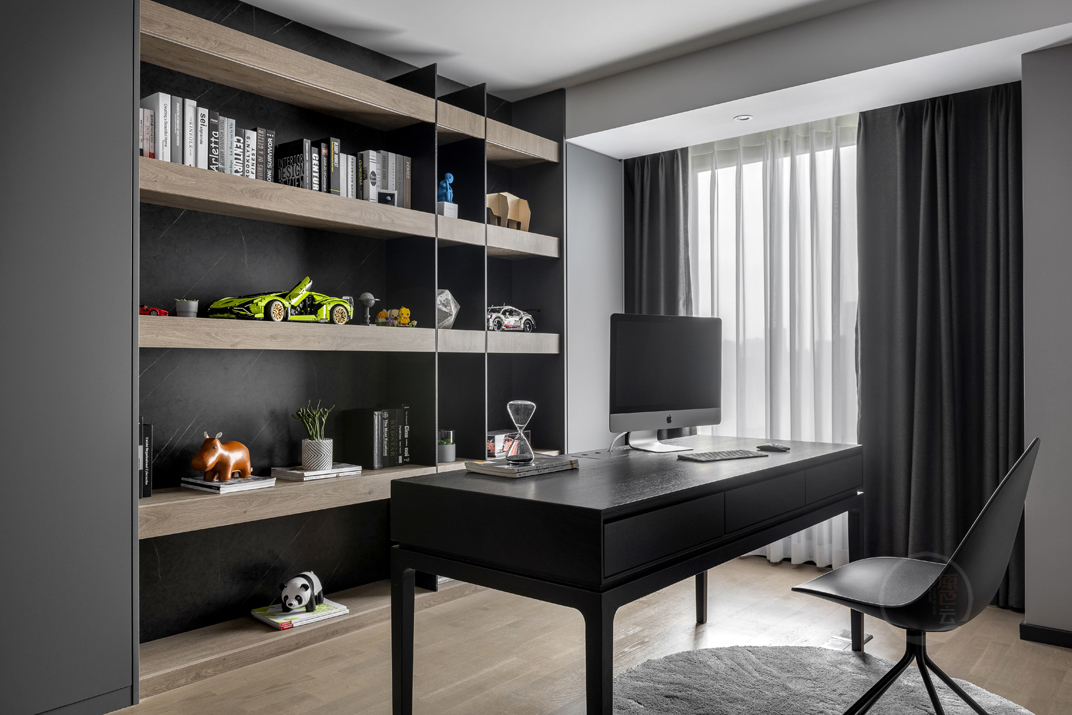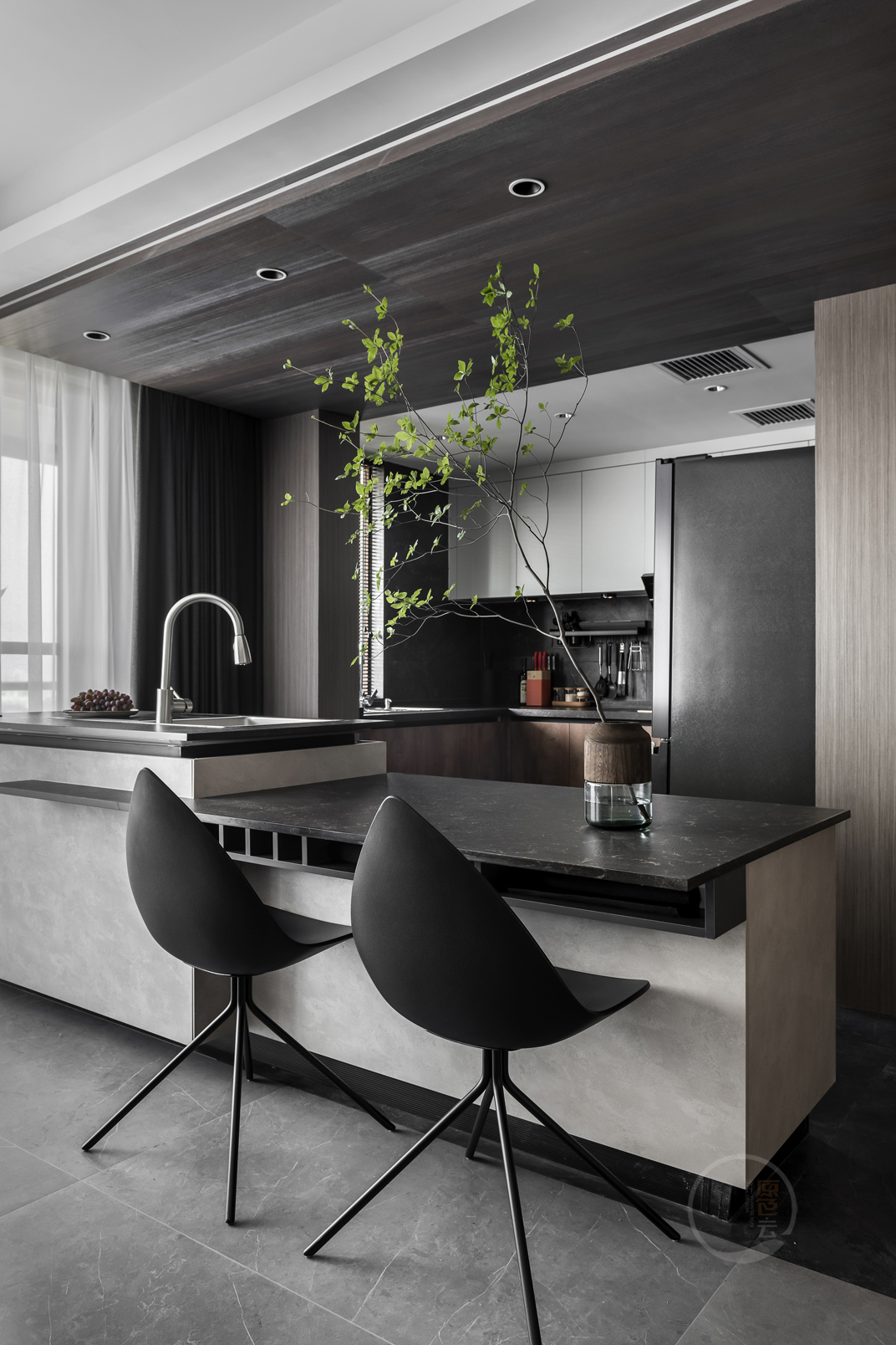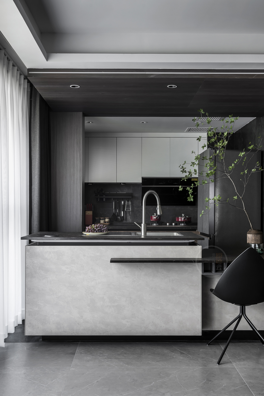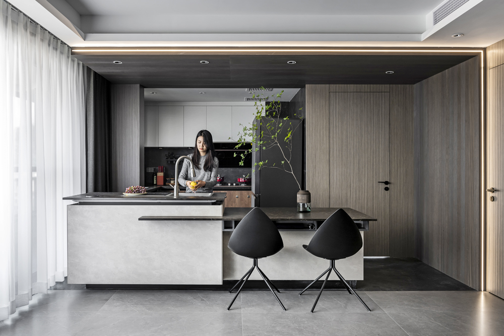 踏入完全开放的空间,现代主义的设计手法,无主灯设计,以简洁到极致为追求;整体黑白灰色调,木饰面、皮革、岩板元素结合,空间被体验,联结,美感也保持同步