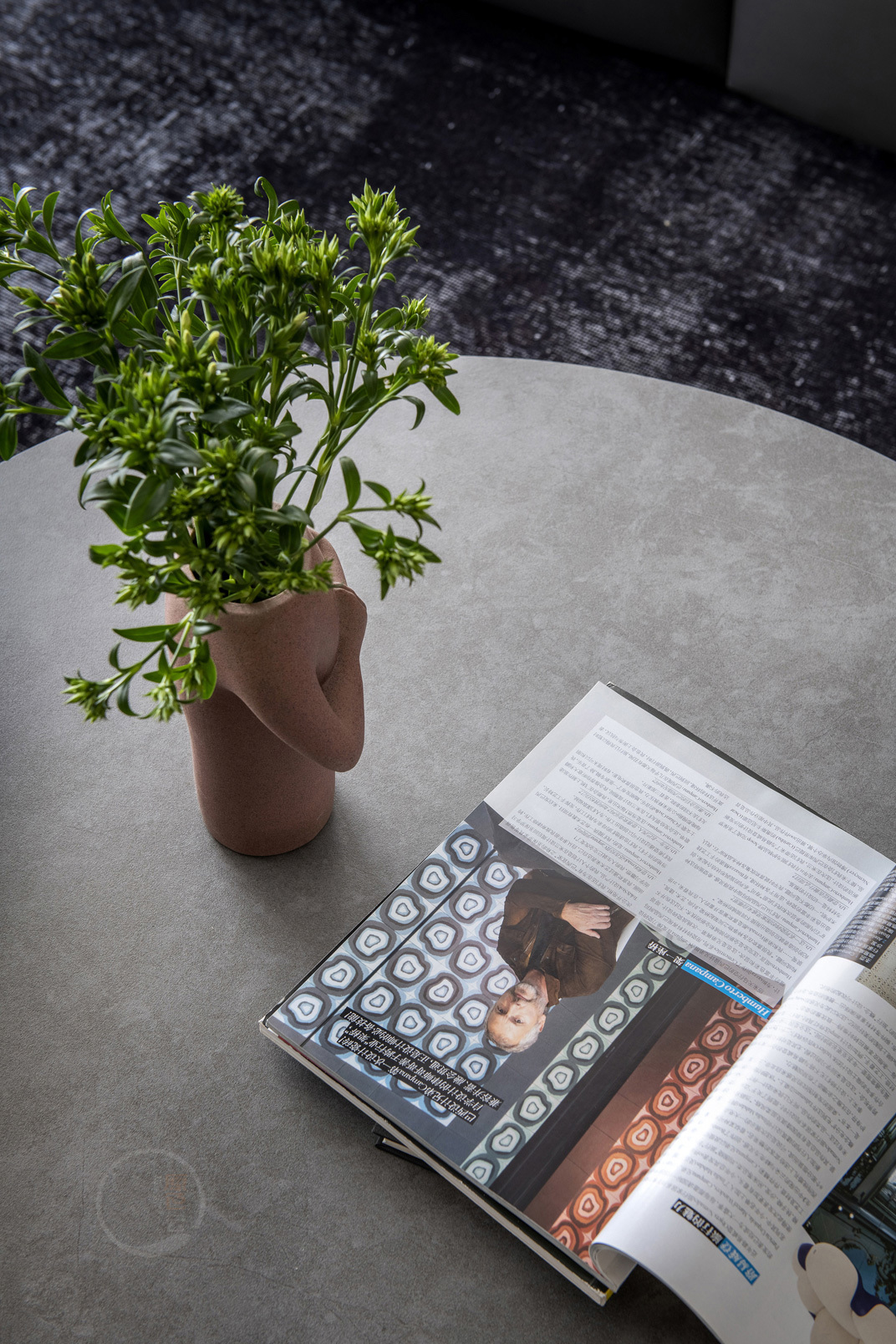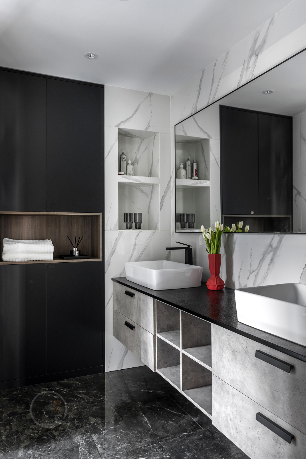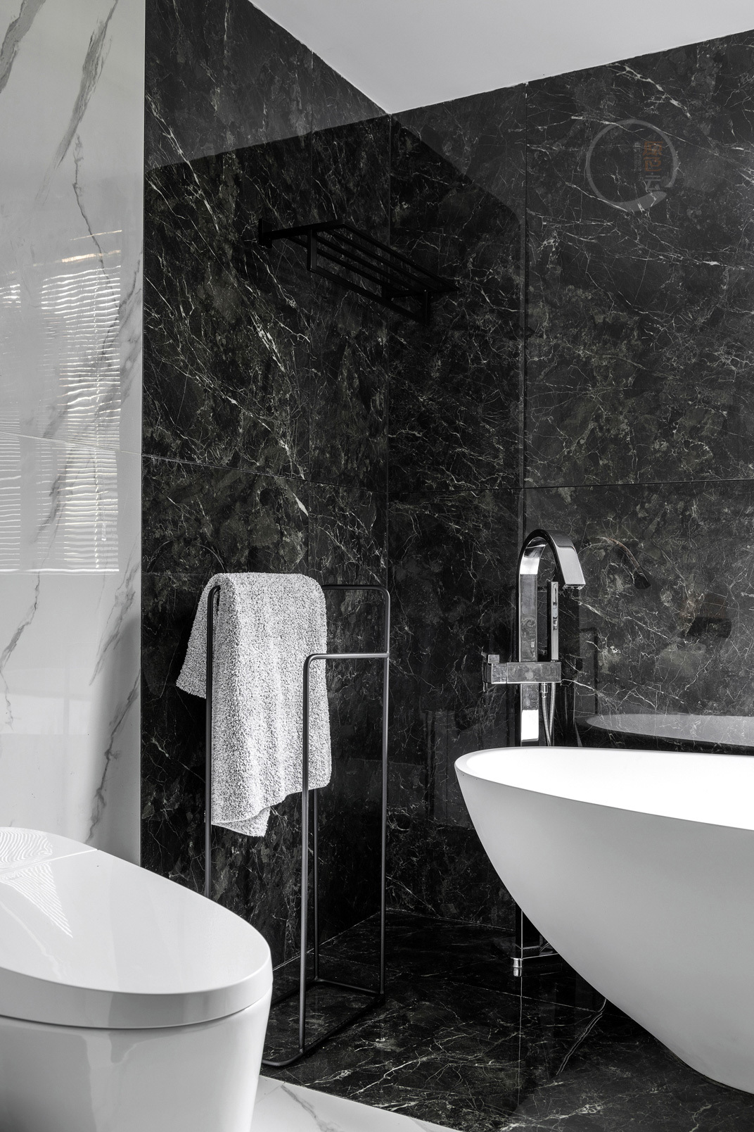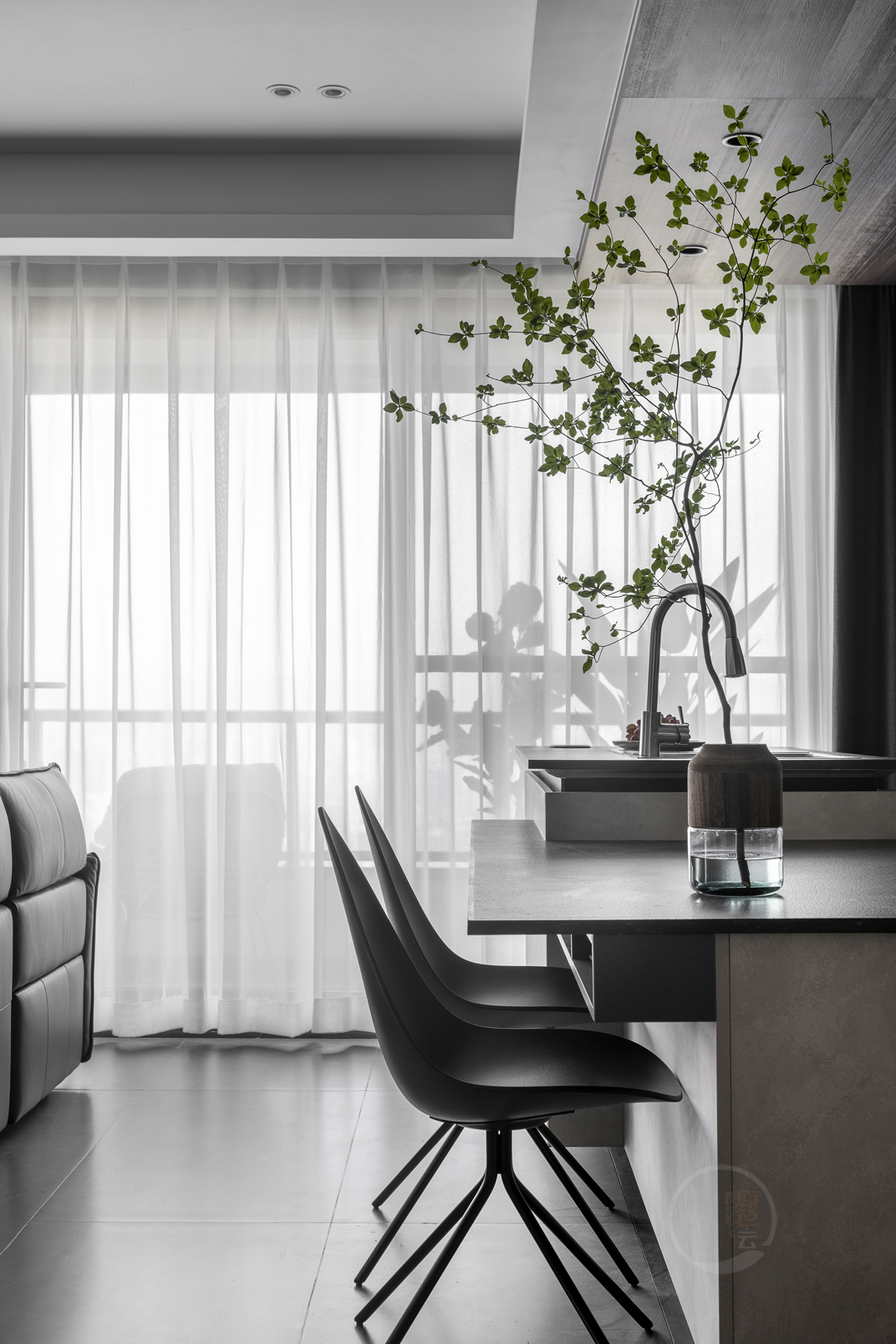踏入完全开放的空间,现代主义的设计手法,无主灯设计,以简洁到极致为追求;整体黑白灰色调,木饰面、皮革、岩板元素结合,空间被体验,联结,美感也保持同步