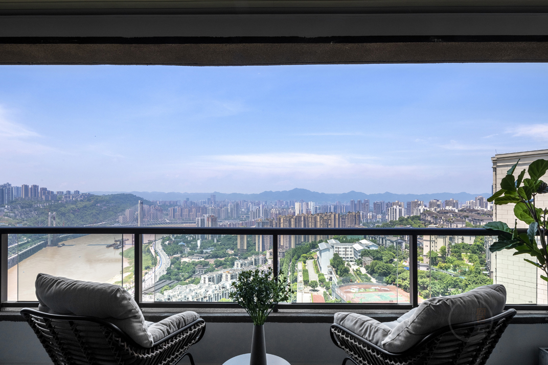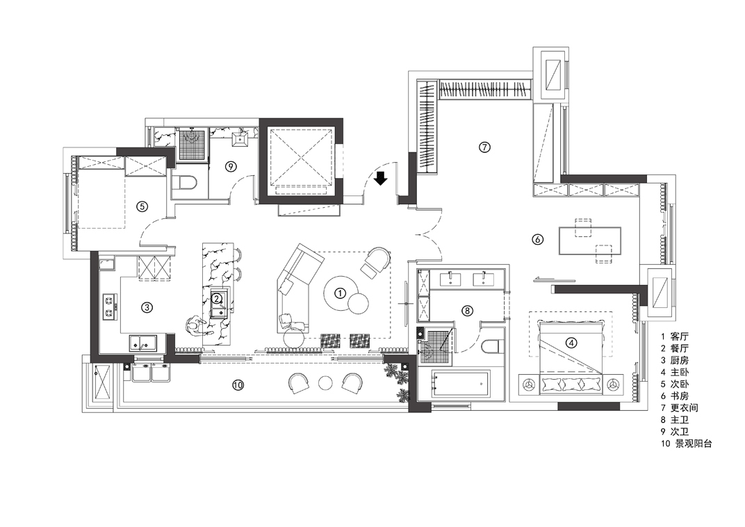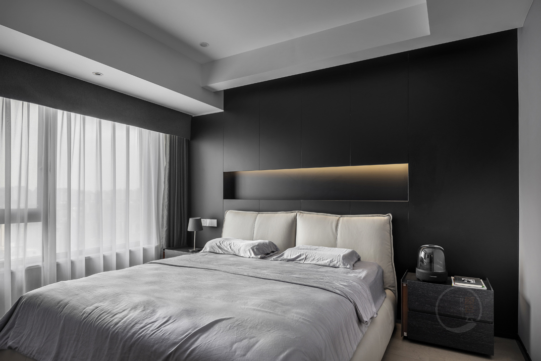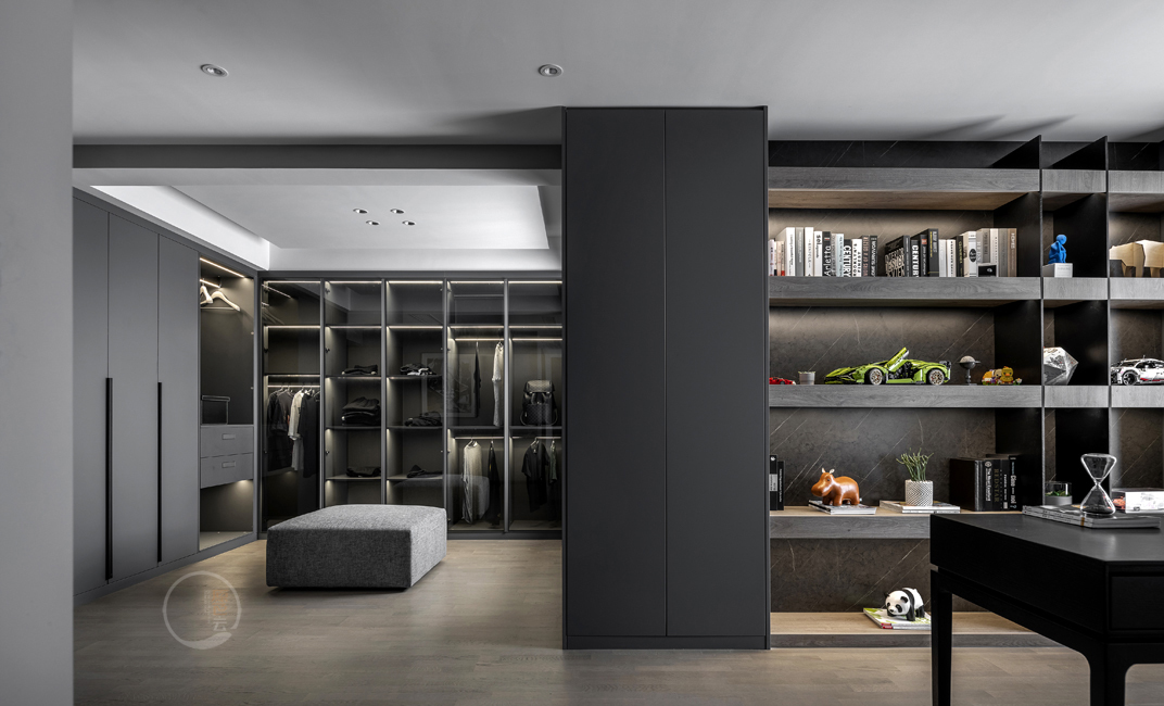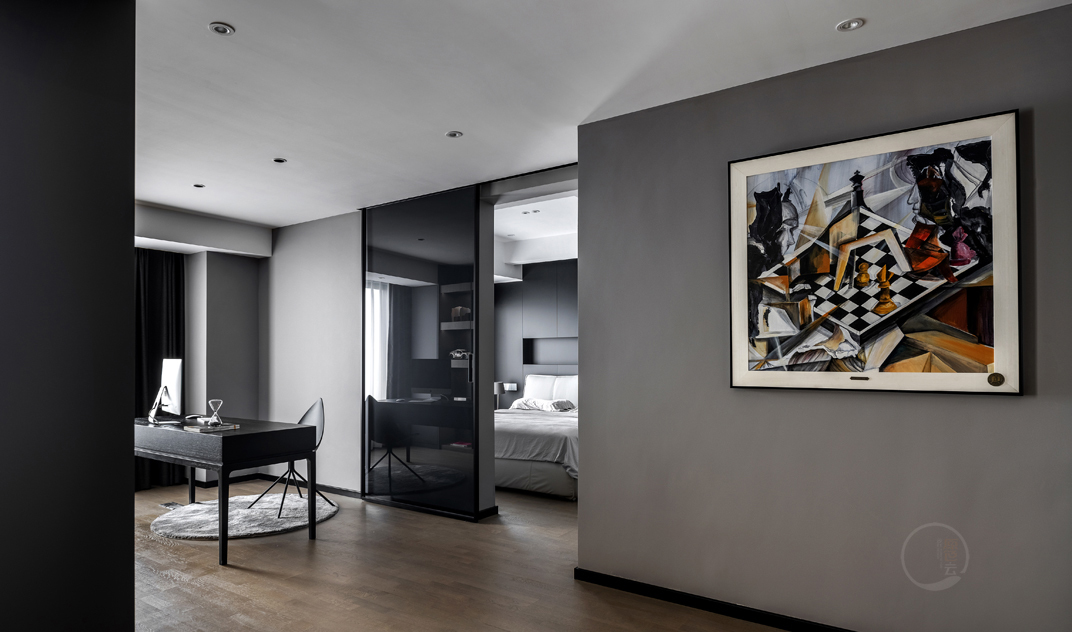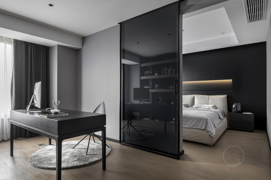 书房踏入主卧,通高玻璃滑门,作为空间的隔断,哪怕夜晚在书房办公,也不会影响卧室另一半的睡眠