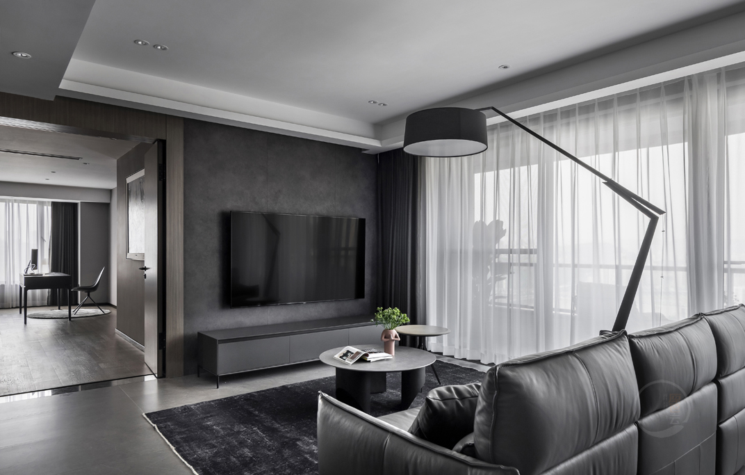 电视墙以深灰色饰面为背景,统一空间色调;吊顶内暗藏投影幕布,休闲模式和影院模式可相互切换