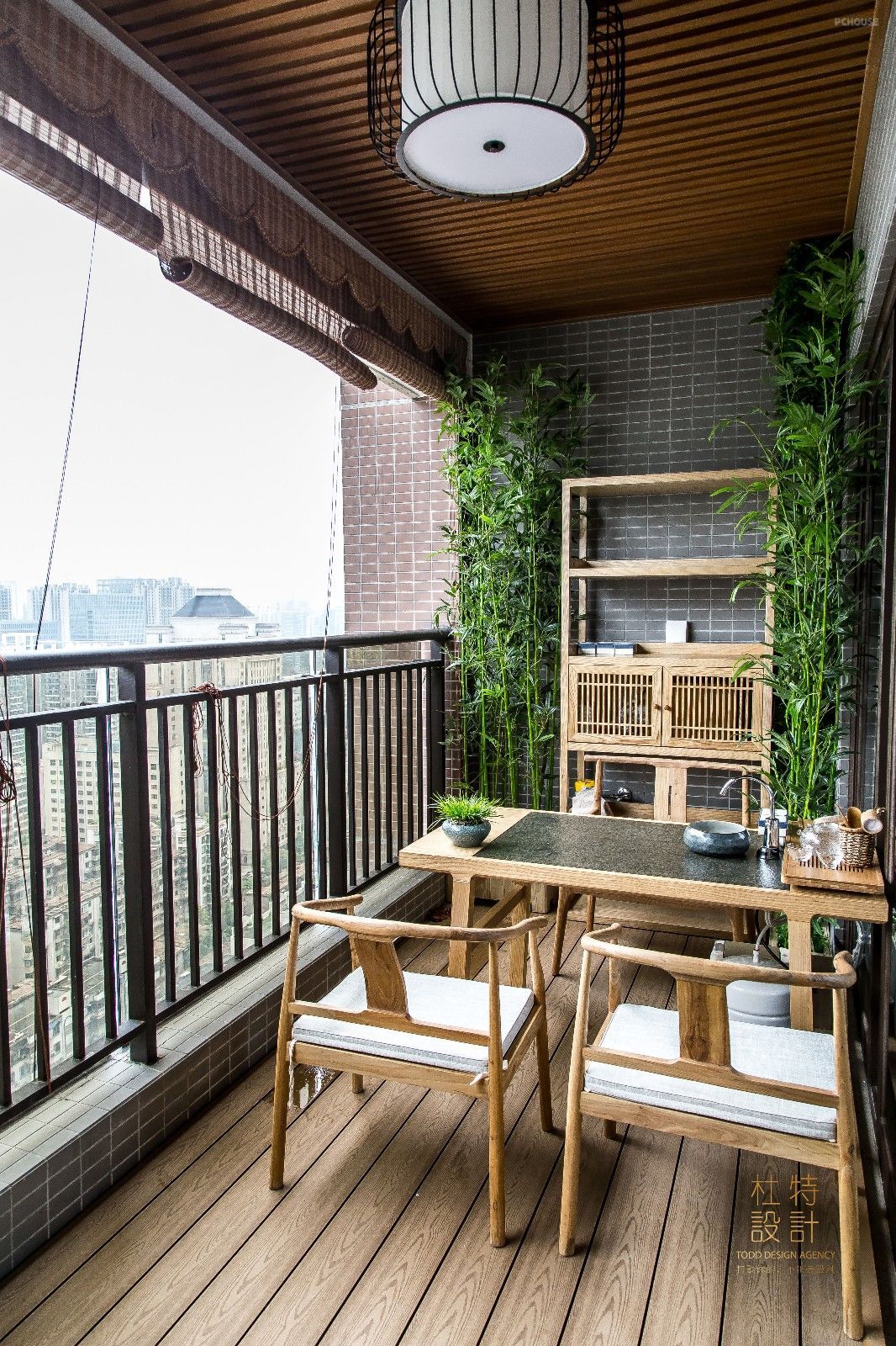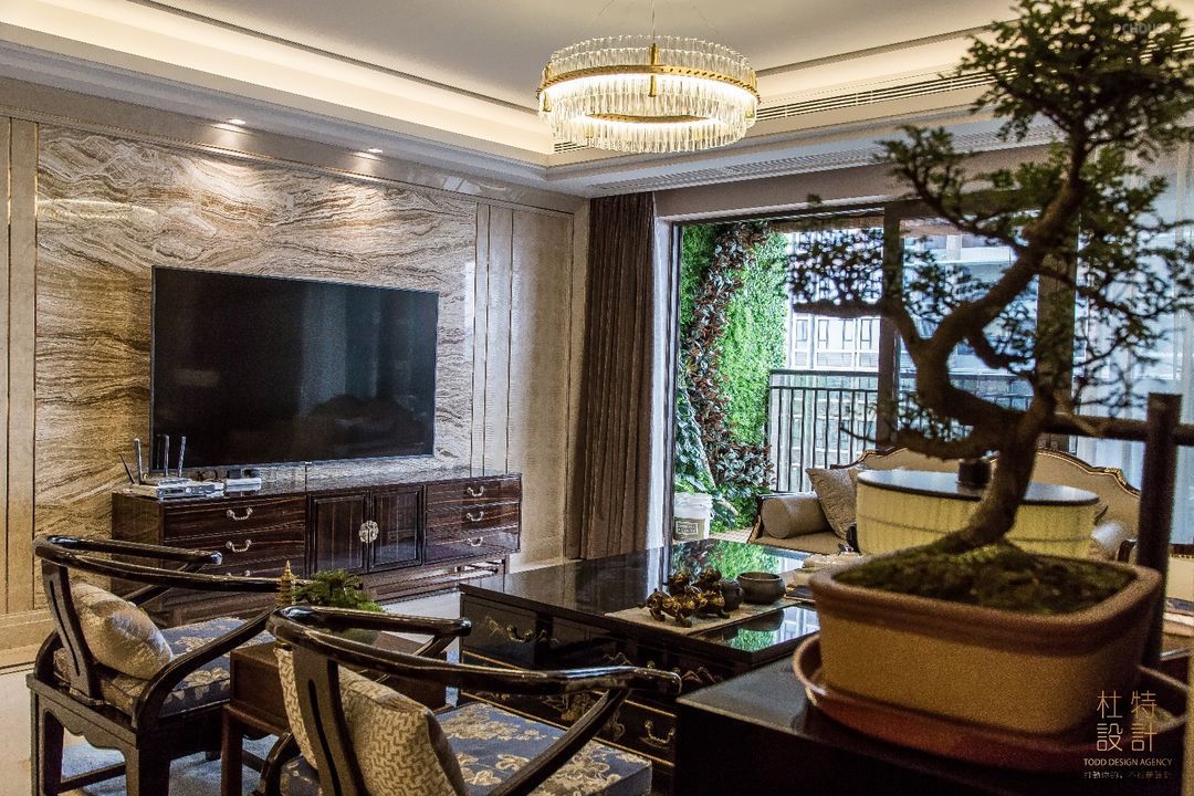 配合明亮的采光,客厅总体采用暗色调,配以黑白搭配的家具,技能显现中国风的古风古韵,又能烘托家居的典雅与舒适。尤其从远视角望向阳台的一抹绿色,给居住者以满满的生命力。