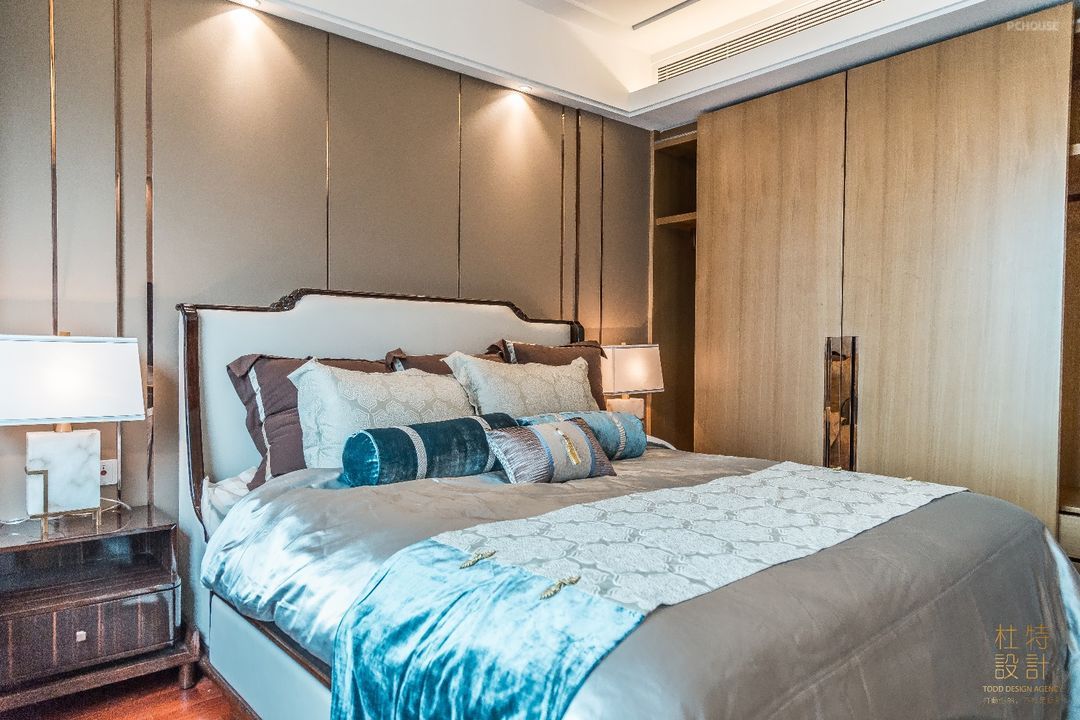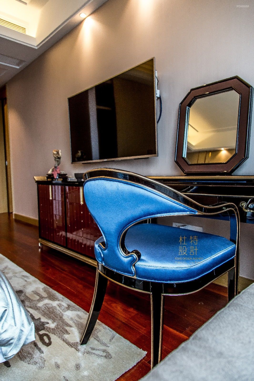 主卧的设计结合屋主的个人特色,配色上既沉稳又不失激情,采用传统的灰色、朱红等主色调的同时,又选择蓝色的对比色进行搭配。再辅以暖色的光源加以映衬,暖暖的,很舒心。