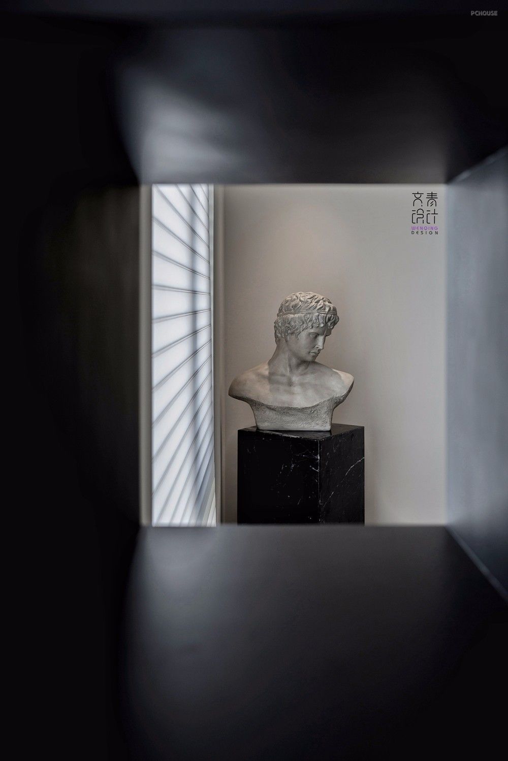 光是电视背景墙悬空设计让书房和客厅在空间上融合,客厅左侧的书柜也可以让视线穿过,尽头处,你的思绪便被这尊石膏掐住了。视觉上的极简,细节上的精致到点。