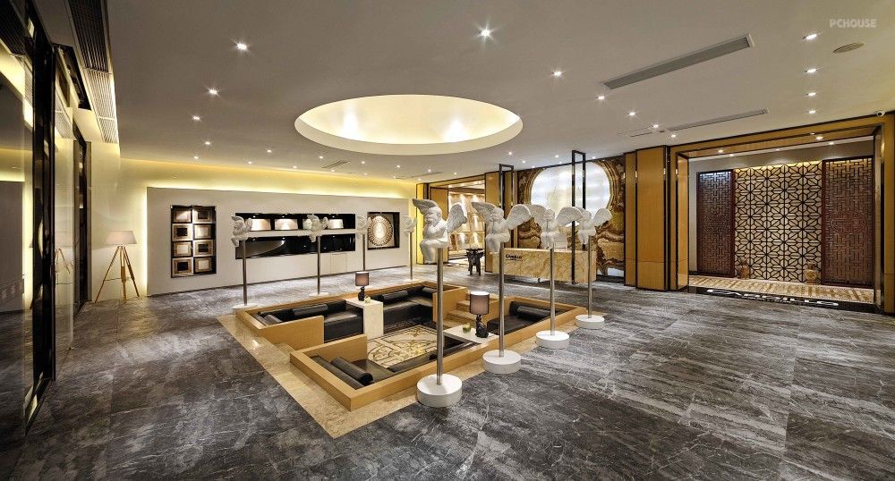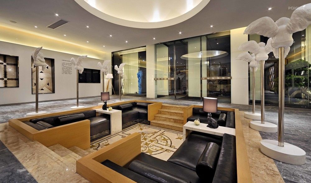 此间应用到了下沉式的方形接待区,另空间赋有层次感
