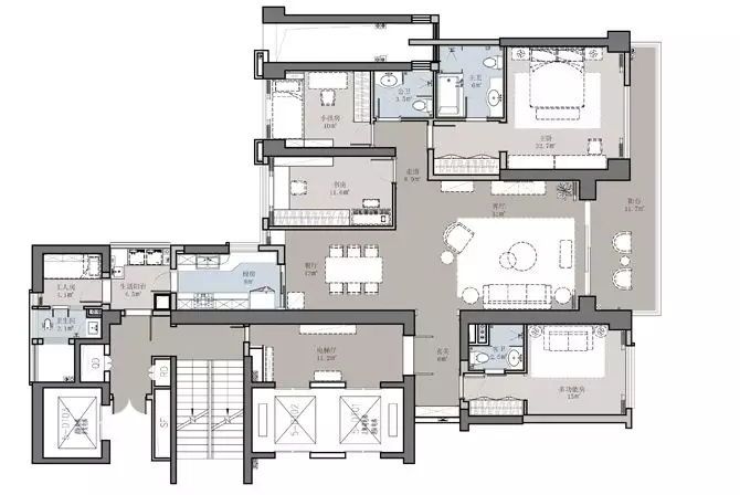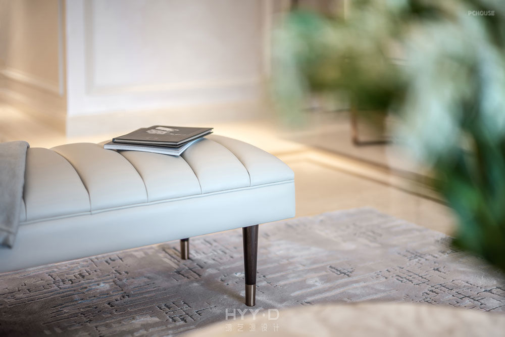 家具家私等采用拉扣工艺,例如客厅沙发、条凳、餐椅、主卧床具等,增加了细节性,同时也丰富了空间的层次感。