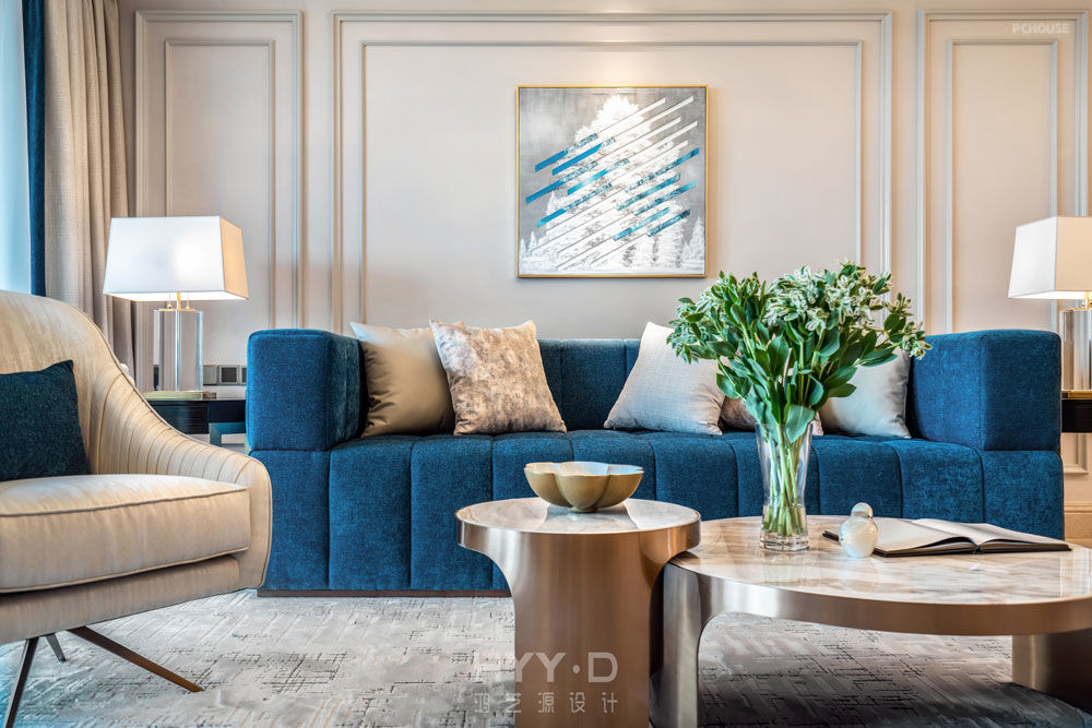 配色:米白色、浅咖色、蓝色、白色、金属色。宝蓝对于空间尊贵感的营造功不可没,纯净的白色、品质感的金属色,让空间充满低调奢华的美感。