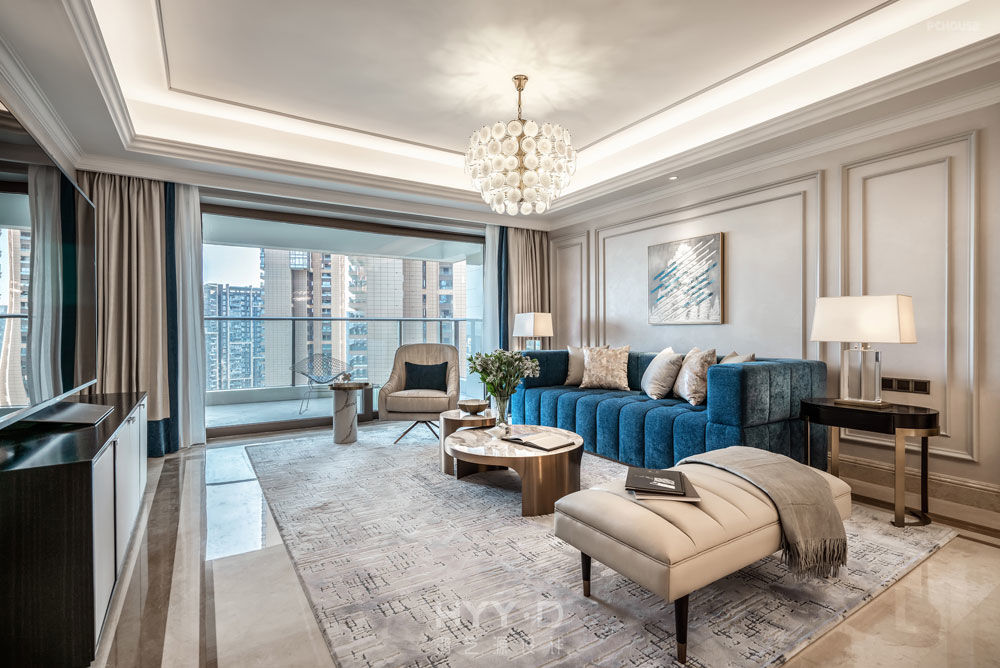 客厅布局开阔明亮,所有的线条简约而规整,克制且必须。灰白的低调让渡出更多的视觉焦点以承载孔雀蓝的高贵,诉说着一种精致清雅的存在。