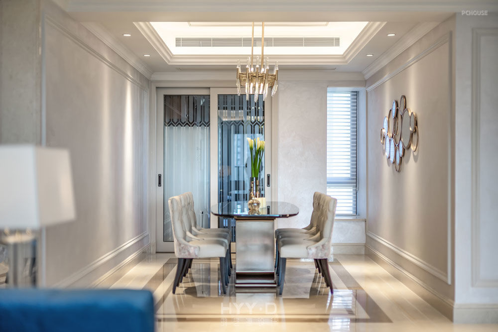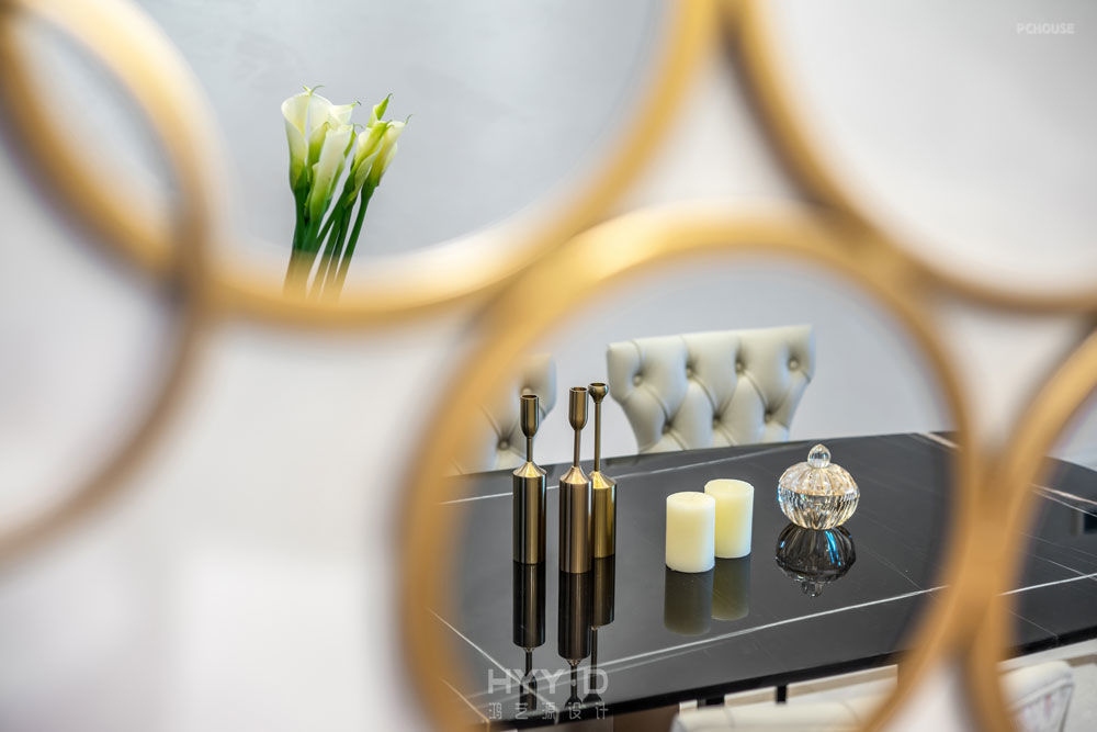 恰到好处的金属元素引导出时尚雅奢的韵味,水晶灯洒下的星辉在餐厅一隅悄然绽放光华。清丽淡雅的花束陪伴着和乐温馨的就餐体验。空间的陈设与所散发的气质与居者是相互影响的关系,居者的品位赋予物以灵魂,而物品反过来也会影响人的心情,甚至是帮助他们找寻到自己真正所追求和热爱的东西。
