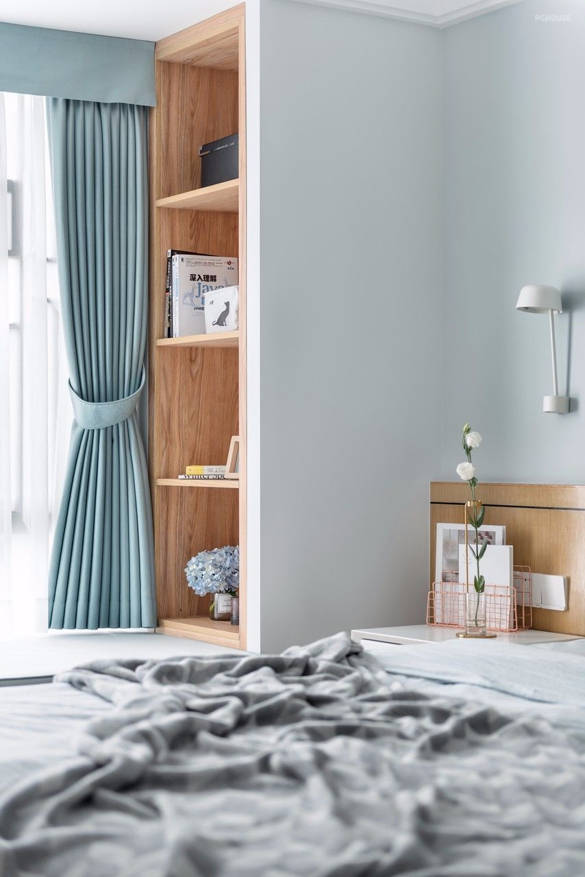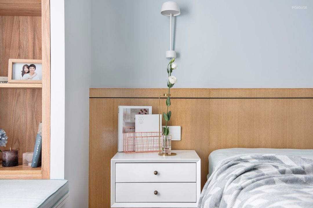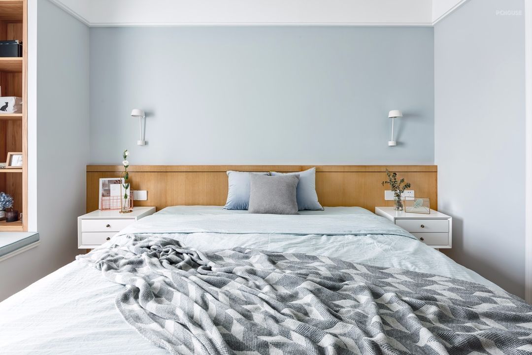 主卧采用低饱和度灰绿色,穿插原木色调,营造温柔静谧的氛围,针织毯随意的搭在床上或者裹在身上,慵懒的感觉令身心愉悦。