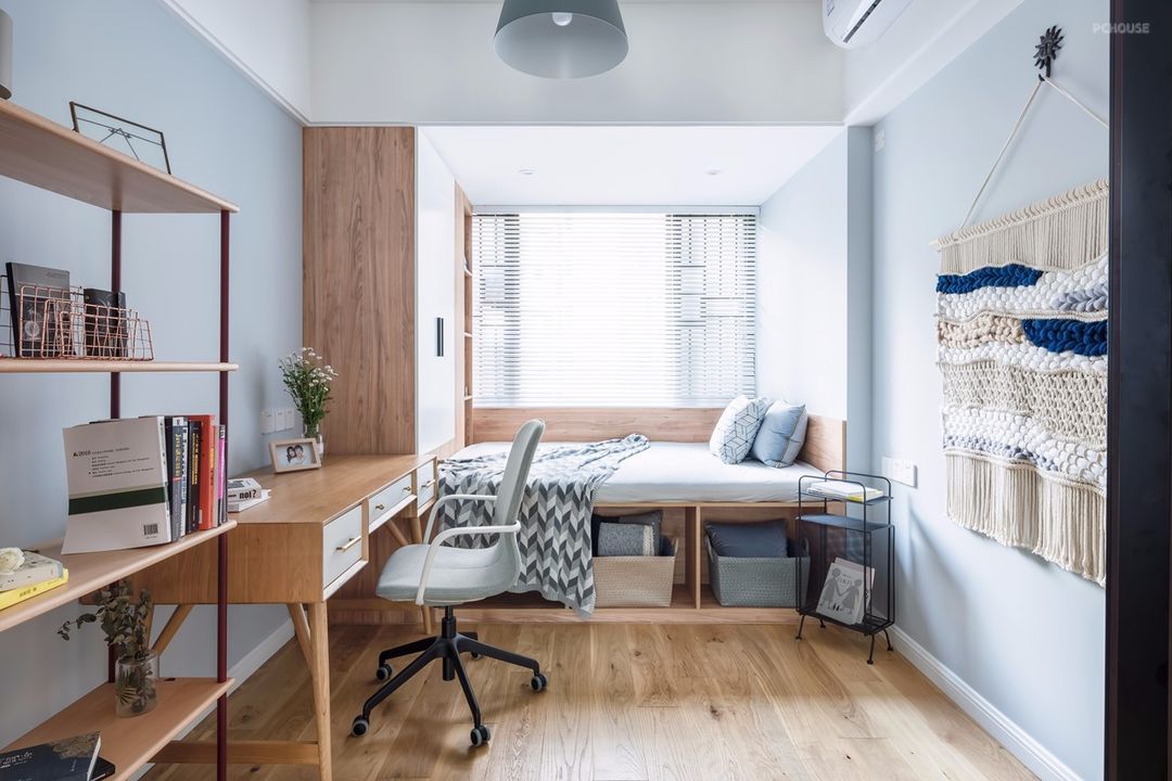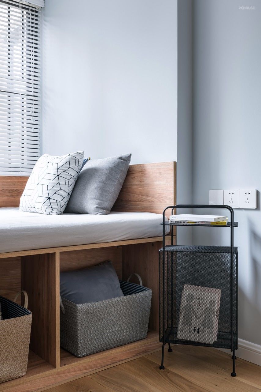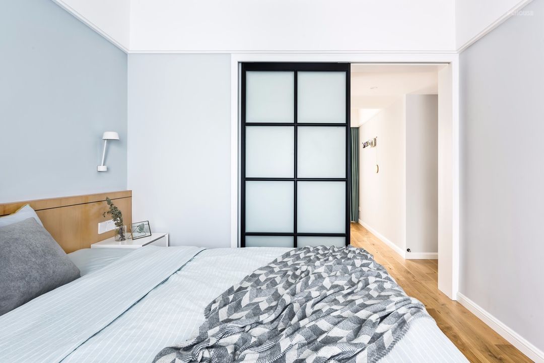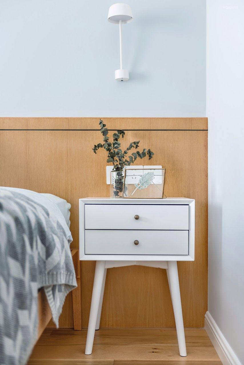主卧采用低饱和度灰绿色,穿插原木色调,营造温柔静谧的氛围,针织毯随意的搭在床上或者裹在身上,慵懒的感觉令身心愉悦。