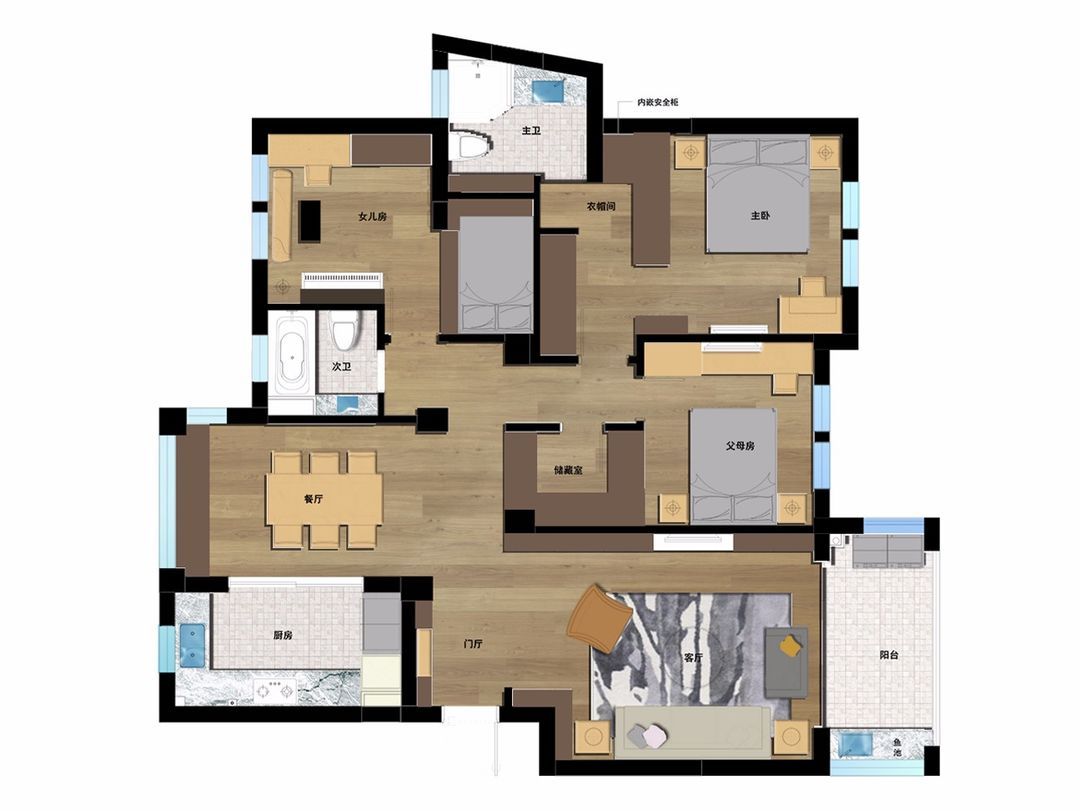 前言: 设计说明:本案户型上的优化集中在静区,给每个房间增加了相当多的储物空间;主卧采用套房设计,主卫、衣帽间、卧室一体!原次卧隔出一个独立储物间在过道,其余空间为父母房使用刚刚好;女儿房,改变了原门的方向,优化后的过道不在显得那么狭长。整个空间墙面以低明度的灰色、豆绿、浅粉为主,白色石膏线装饰,供不同区域使用;家具软装配饰上以实木元素体现美式风格,简单归真,是恰到好处的精致!