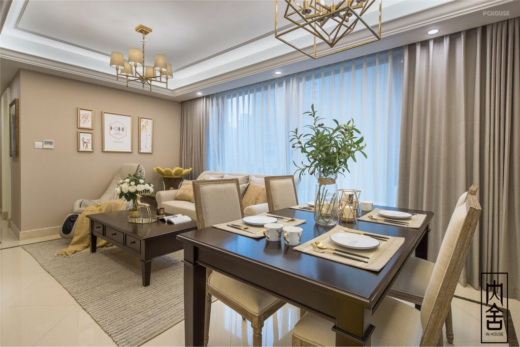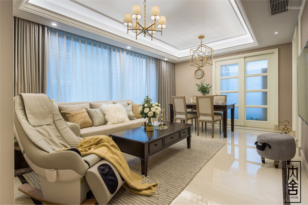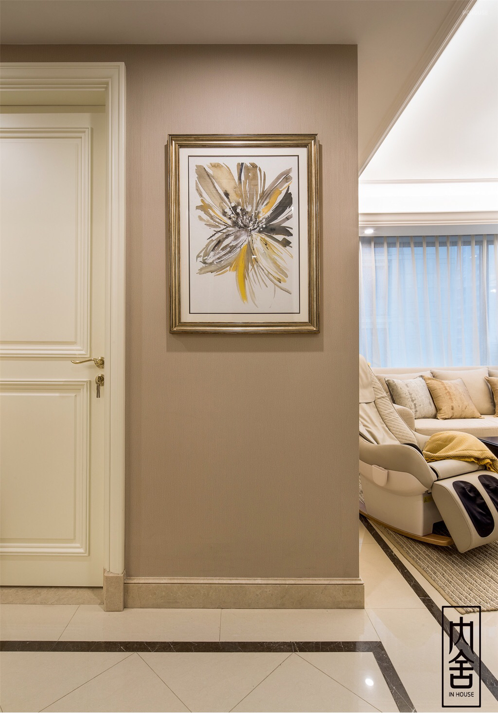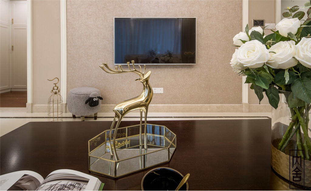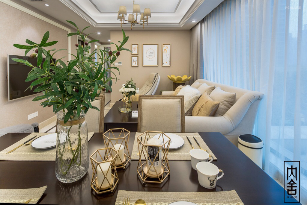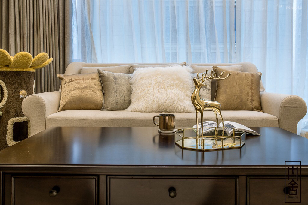 以沙色为主,点缀了淡金色,淡金色的饰品不同于亮金色之处在于,其略微黯淡的色调使得色彩之间不会有强烈的冲击,和沙色相互映衬,营造了温馨的氛围,也体现了女主人的优雅气质。