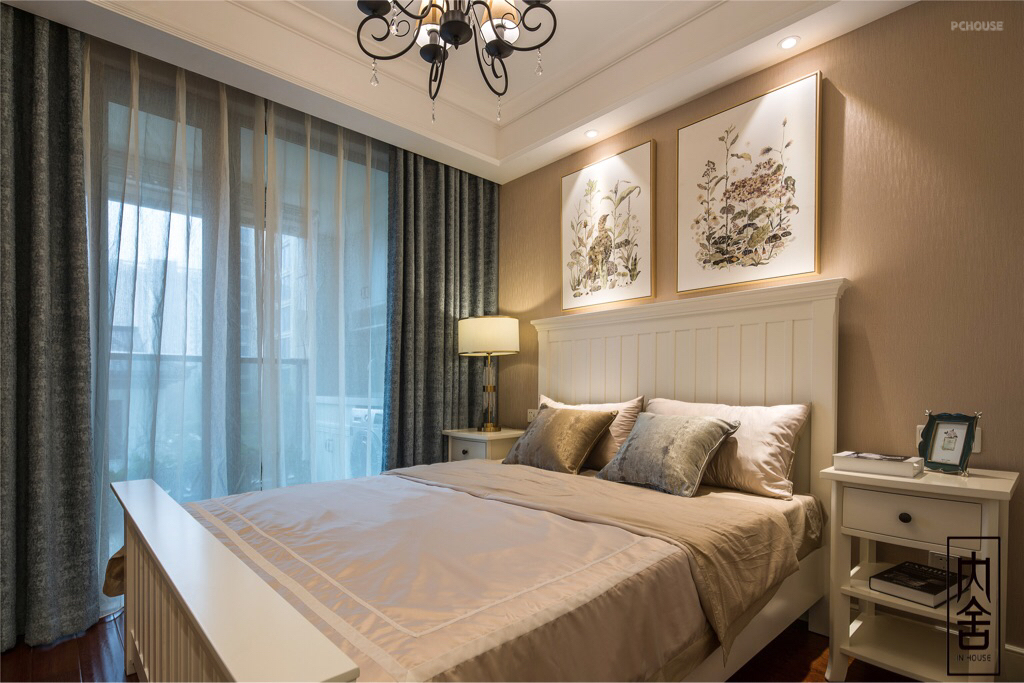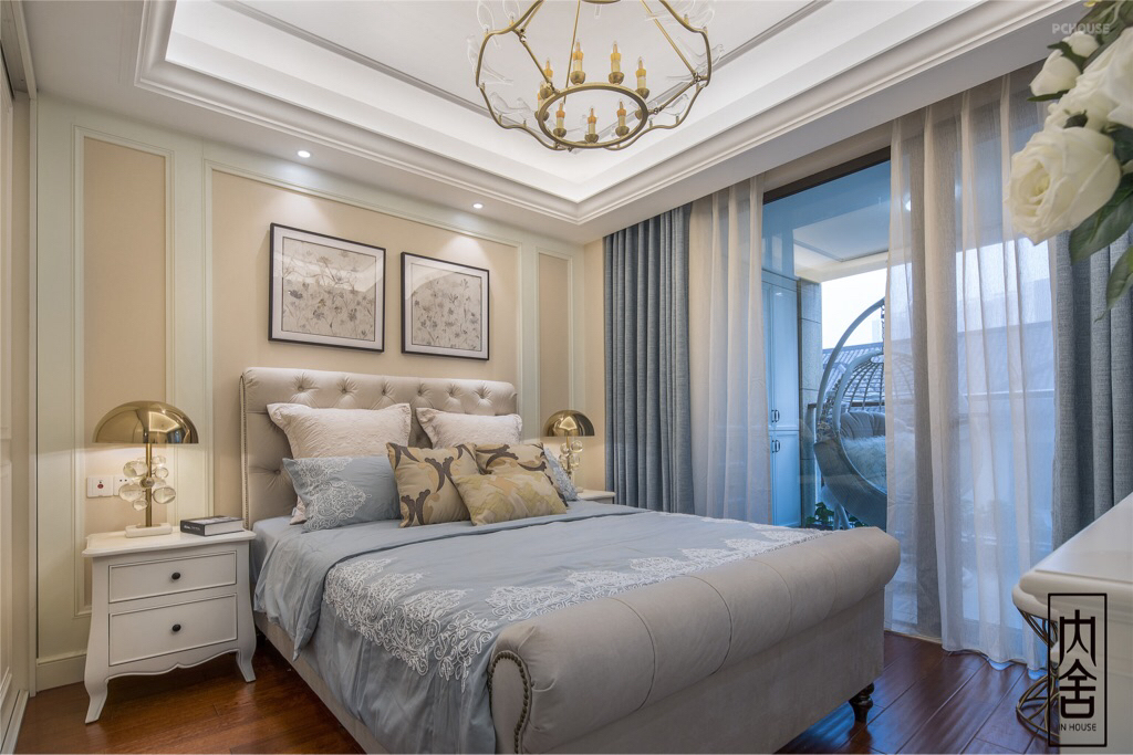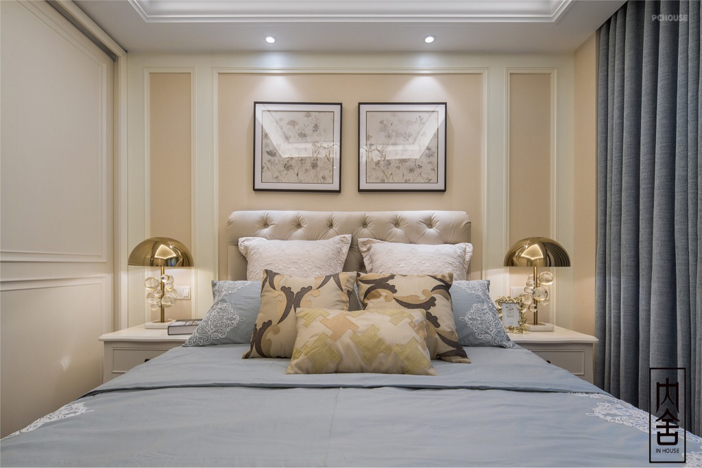 卧室中香槟粉配上浅灰蓝,搭配淡金色的床头灯,仿佛是寒冬乌云密布之时阳光普照大地,给人温暖的感觉,更表现了女主人的淑女风范。