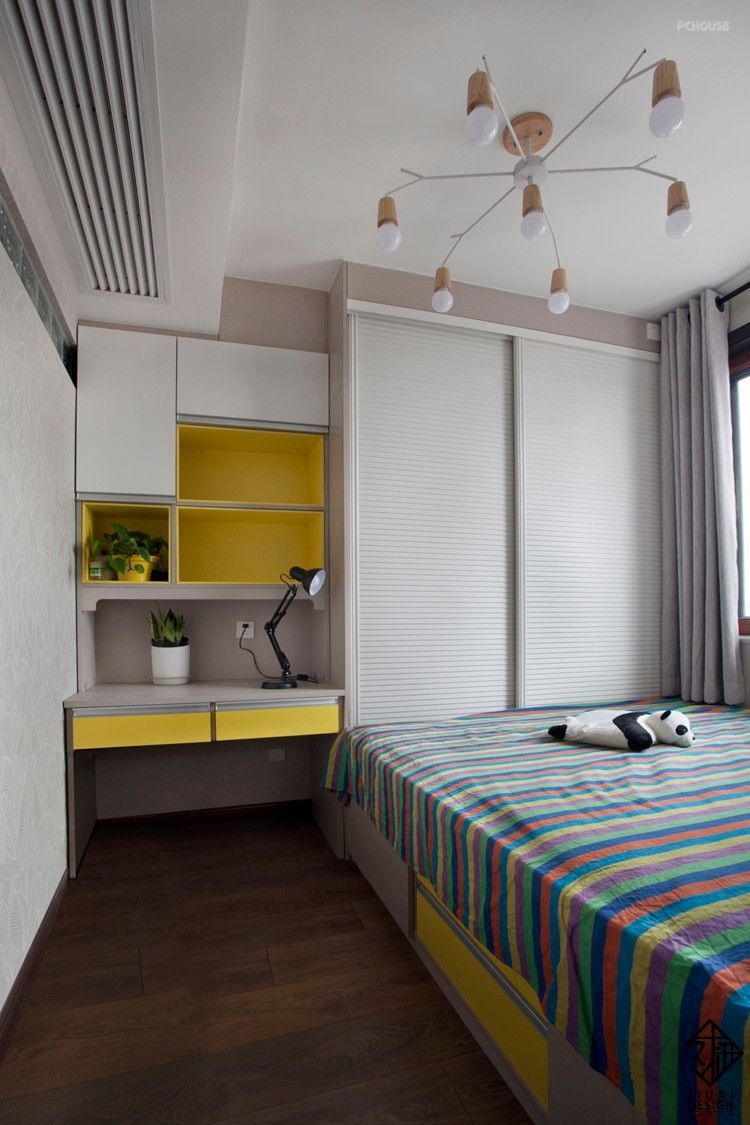 大卧室暖暖的色调伴随主人每一天的入夜清晨。 黄色杏花壁纸,床头圆形白色吊灯代替台灯,不仅时尚还能节省空间。空出床头柜的台面可以放置其他物品。